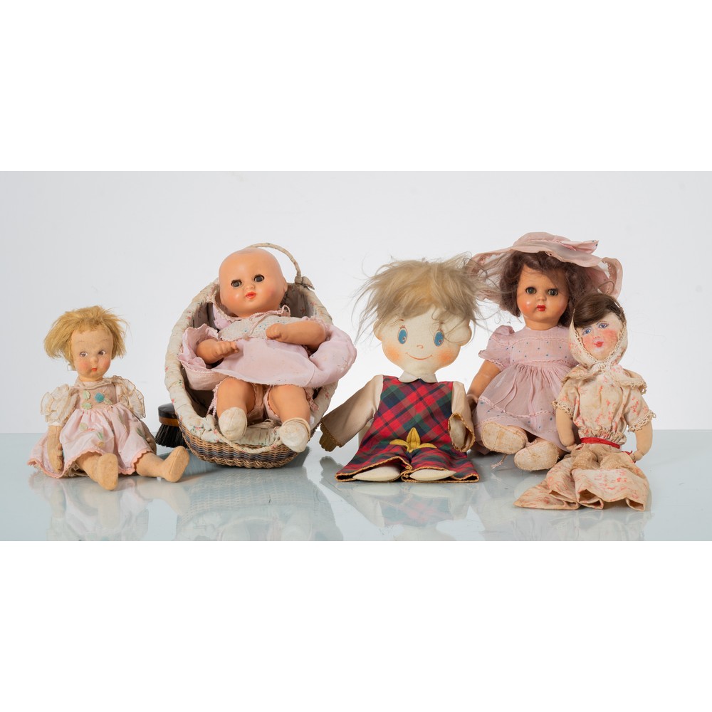CINQUE BAMBOLE di cui tre di pezza, una in celluloide ed una in celluloide automa e culla (usure e difetti).