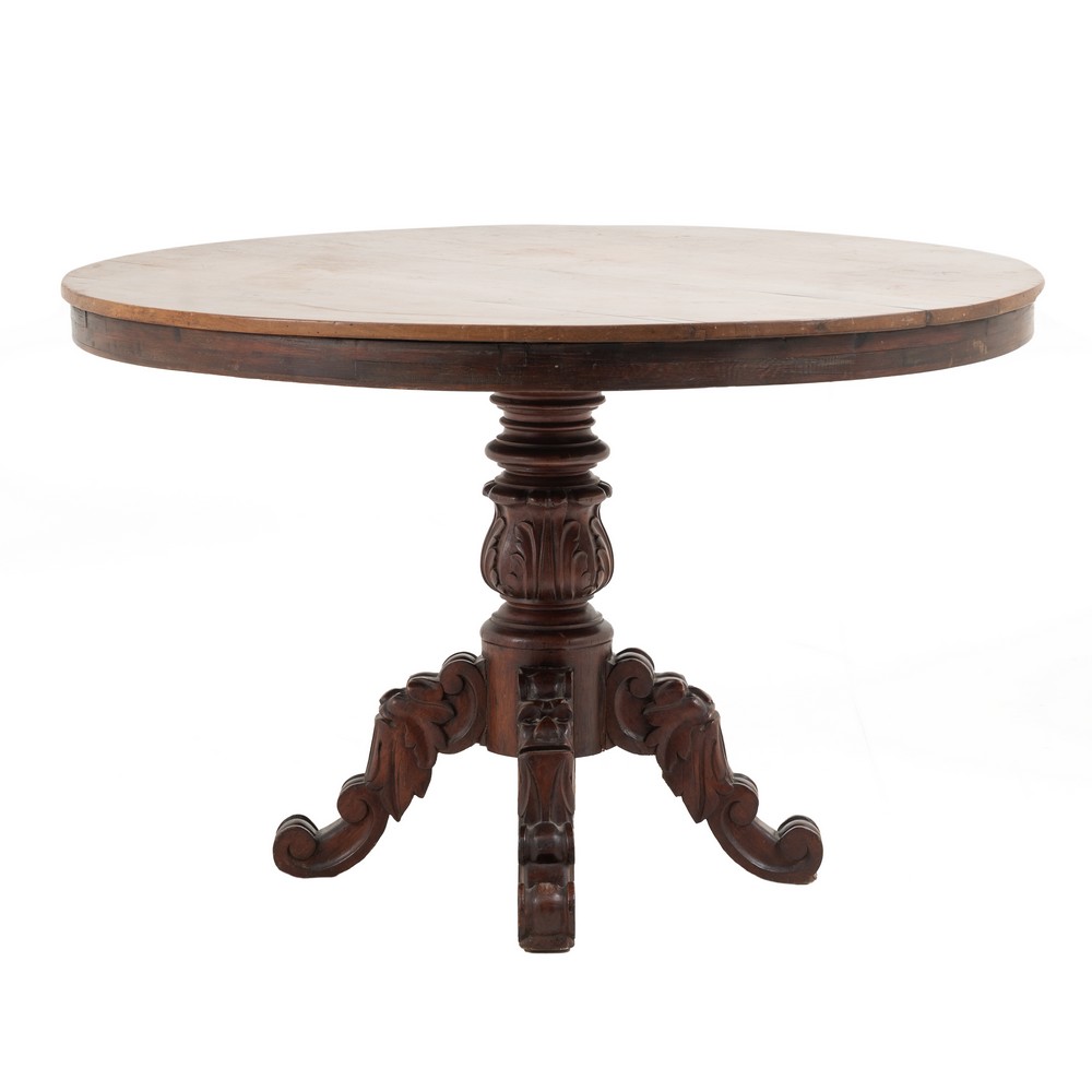 Tavolo di forma circolare in legno di mogano con fusto a colonna e piedi a sciabola (influenza inglese).