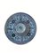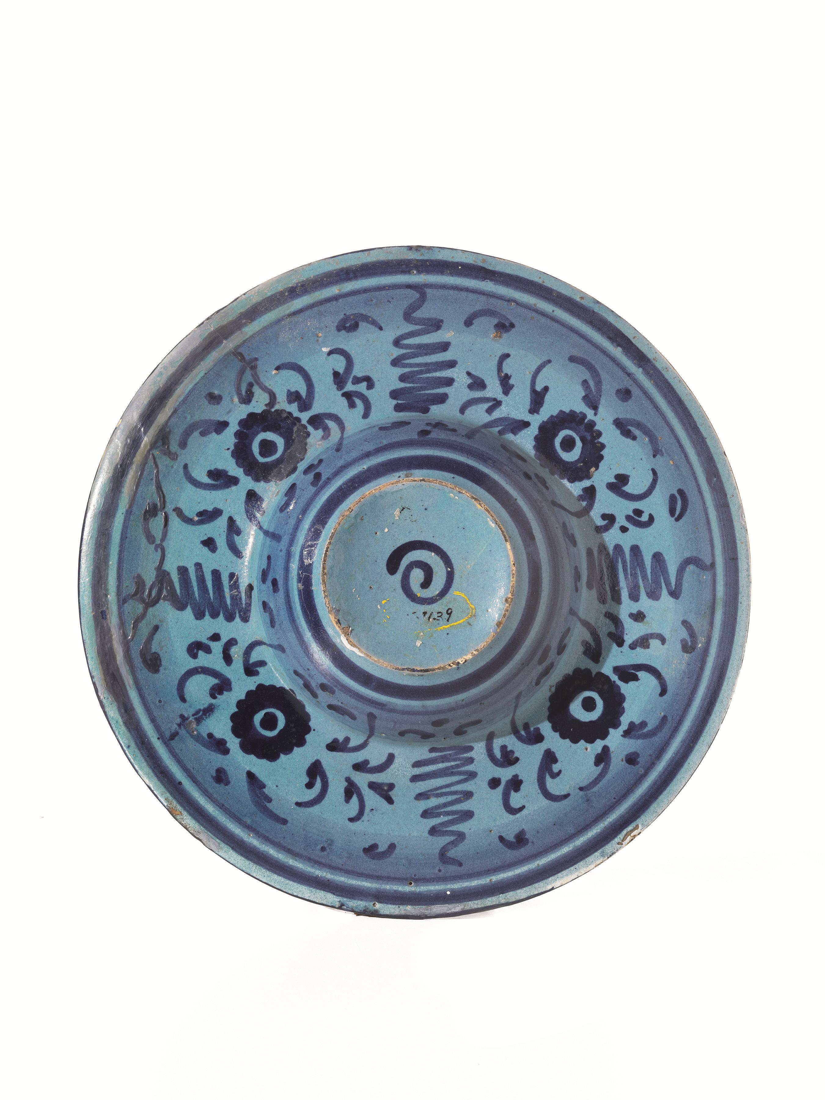 Sulla tesa si estende una decorazione “a grottesche monocrome” su fondo blu, in una variante che prevede una disposizione simmetrica centrata, nei punti cardinali, da mascheroni intervallati da teste di amorini e delfini affrontati, connessi da girali continue. Sul verso, all’interno del piede, si registra la presenza di una spirale blu; tutt’intorno sulla tesa vi è un motivo “alla porcellana” disposto simmetricamente col fioretto a corolla continua, tra serpentine, dipinto in blu.