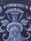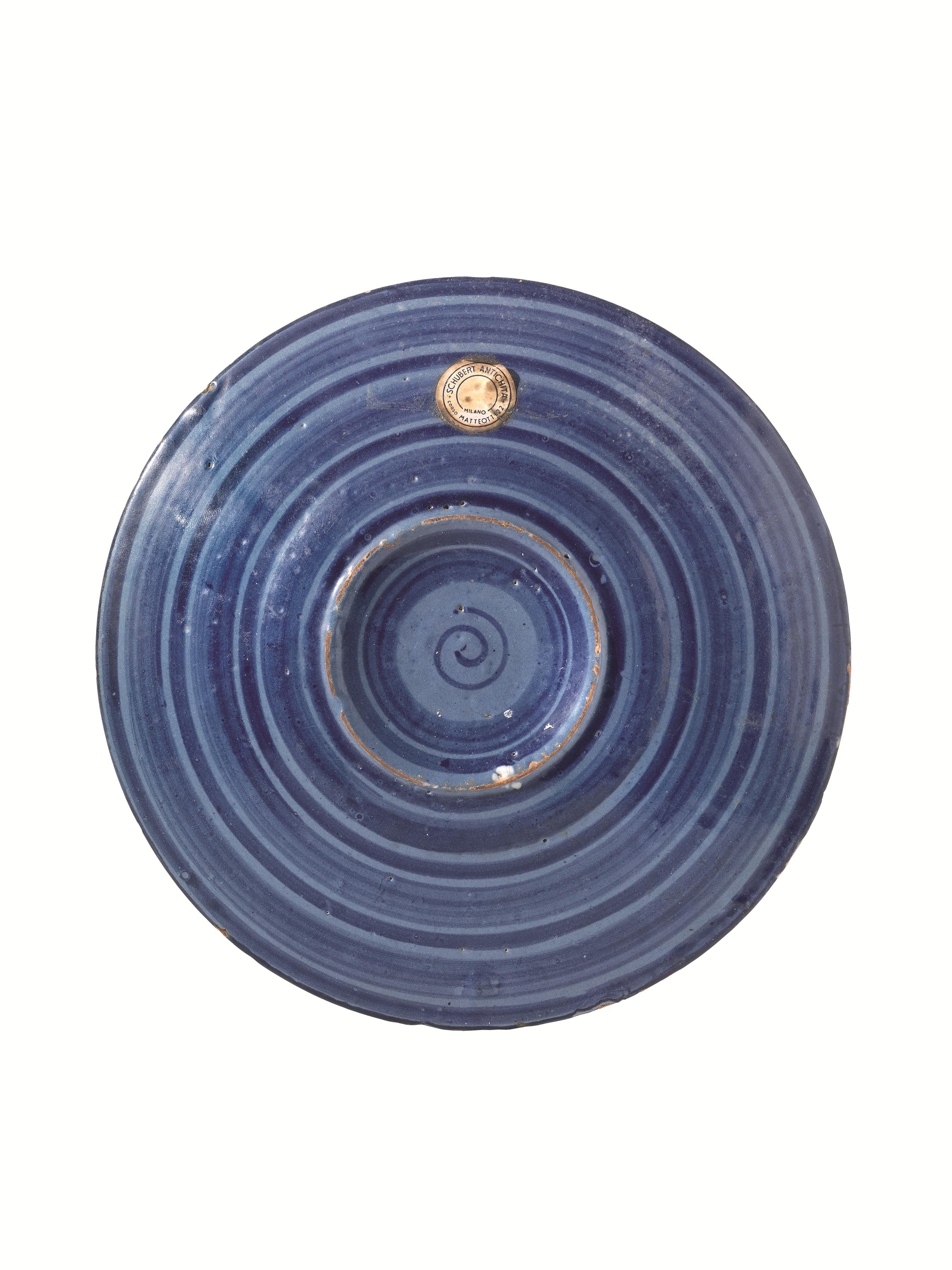 Sul retro si sviluppa un motivo decorativo a linee concentriche, realizzato su fondo berettino in tinta blu, che termina in una spirale al centro del cavetto; tale decoro ricorda i motivi “a calza” spesso utilizzati a Faenza nel secolo precedente.