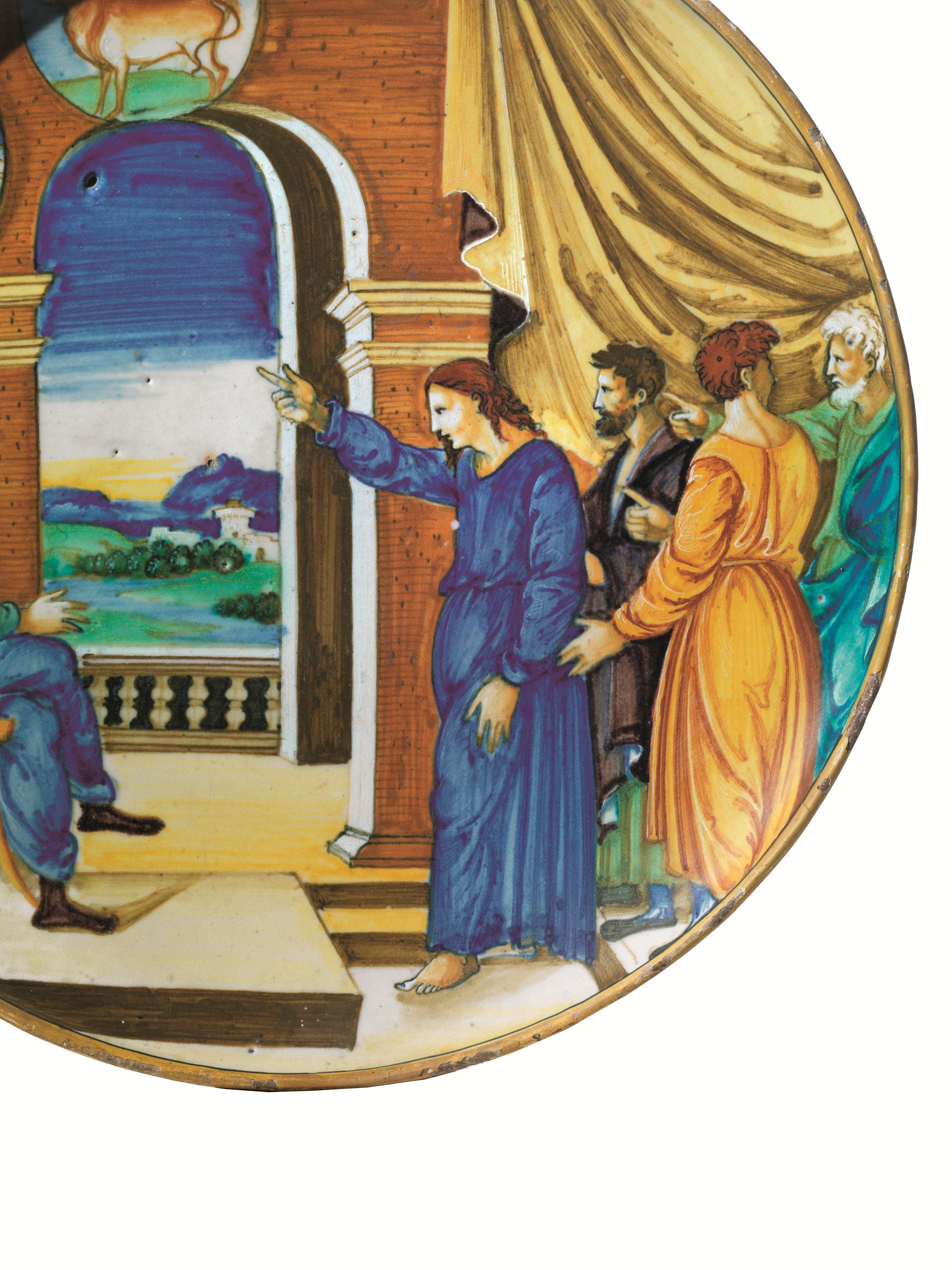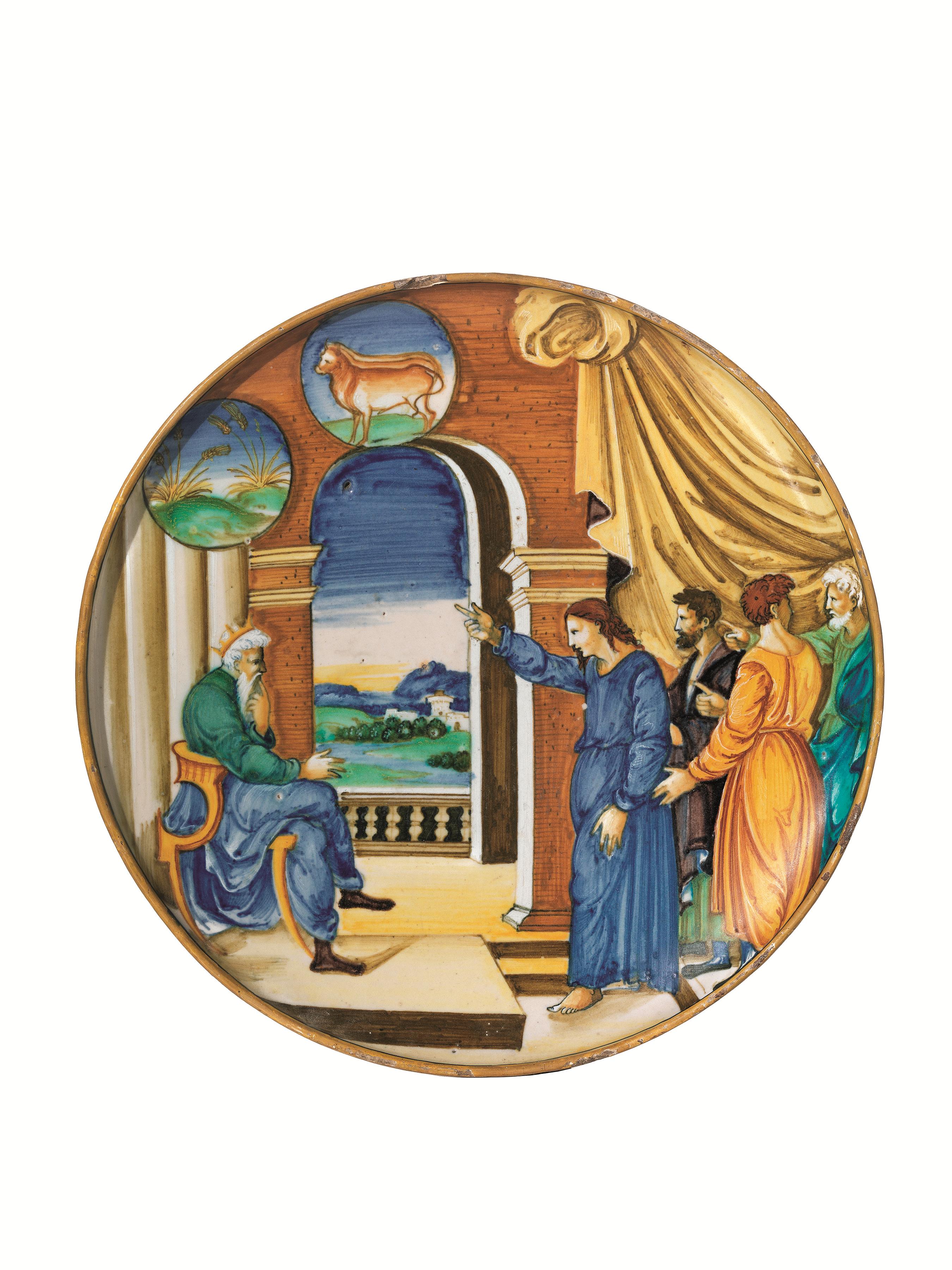 Questo piatto è esemplare per una rapida rilettura della storia degli studi sulla maiolica marchigiana del ’500. Nella collezione Charles Damiron l’opera era attribuita all’artista, chiamato allora Nicola Pellipario, e datata verso il 1530. Bernard Rackham, nel suo studio sulla collezione Adda, per il modo di dipingere i volti e di stendere i colori l’uno sopra l’altro ipotizzava la mano di Francesco Xanto Avelli, sotto l’influenza di Nicola Pellipario.