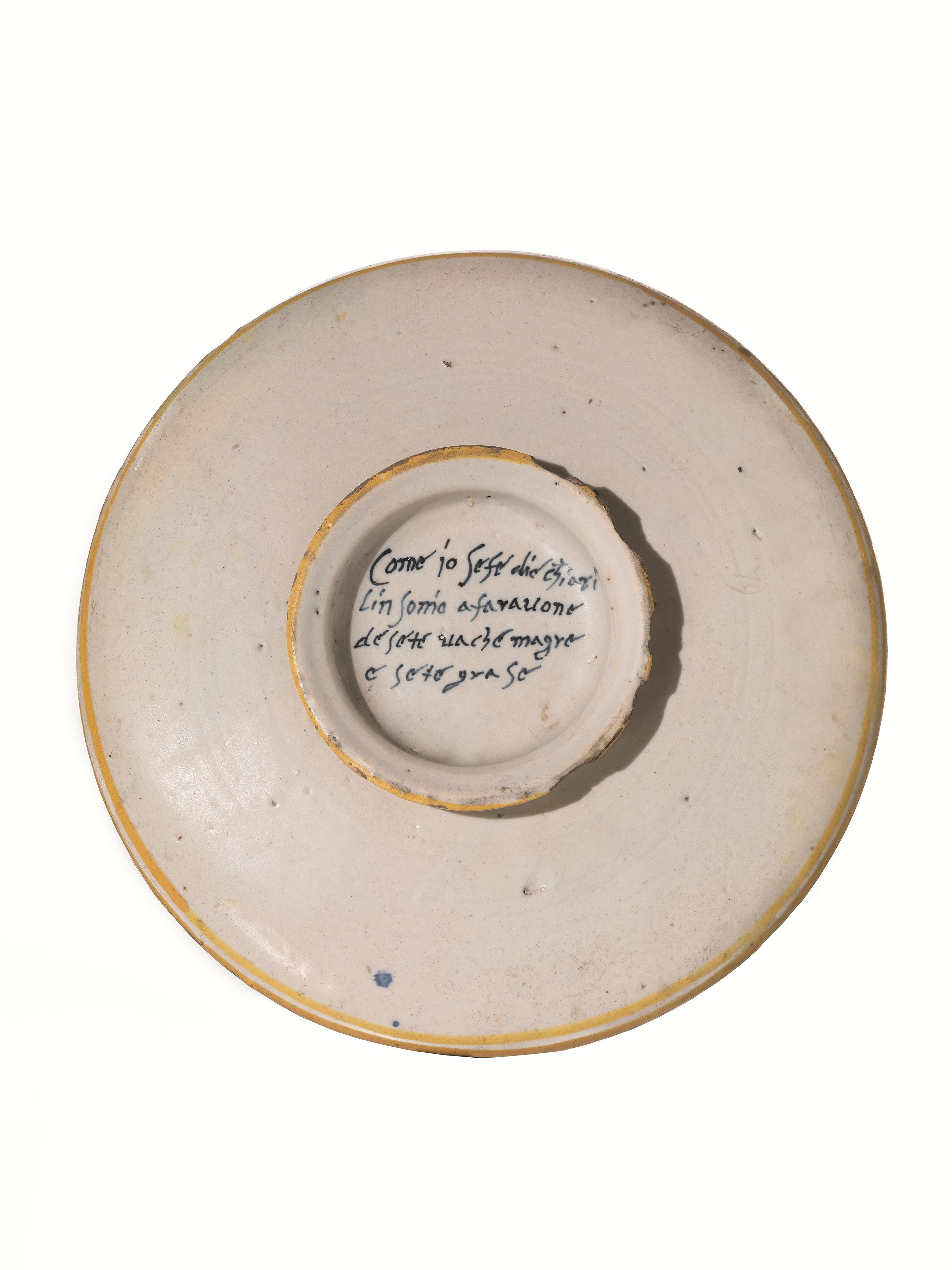 On the back, beneath the base, inscription in blue ‘Come io sefe die chiari/ linsonia afarauone/ desete uache magre/ e sete grase’