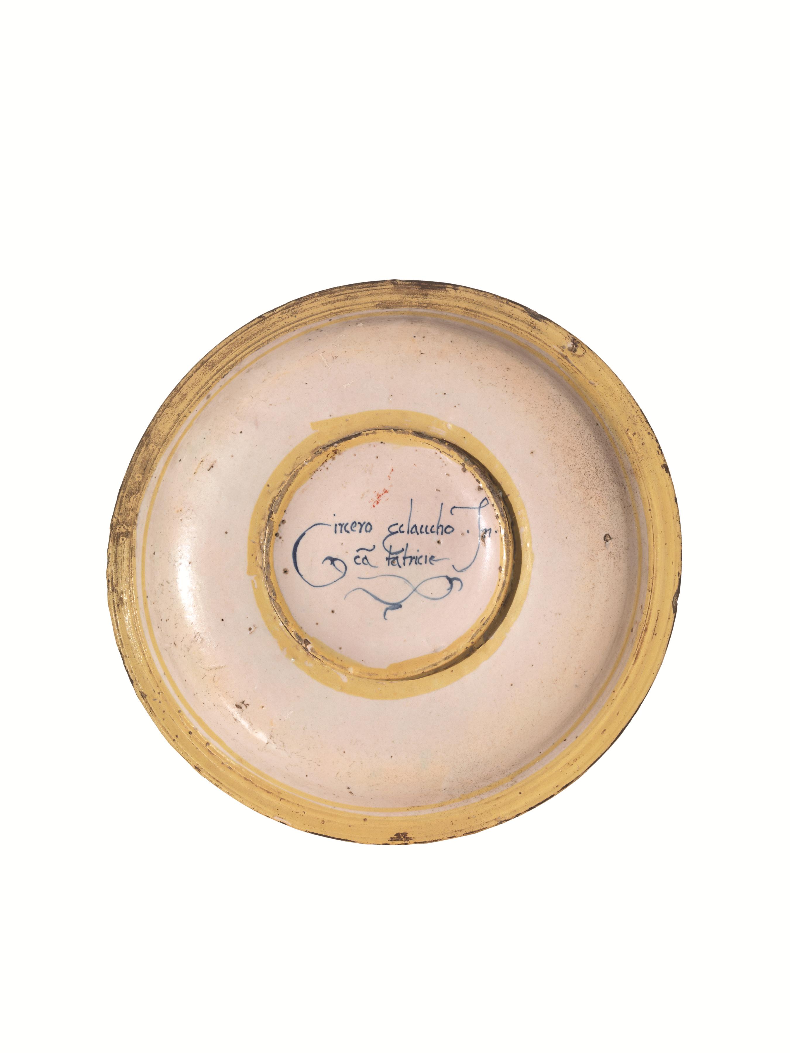 La coppa, poggiante su piede ad anello molto basso, ha cavetto largo, tesa alta e stretto bordo estroflesso. La decorazione istoriata interessa l’intera superficie del cavetto. Sul verso, decorato da linee concentriche gialle a sottolineare i profili, è elineata all’interno del piede la scritta “Circero Glaucho. In./ Cantatricie”.
