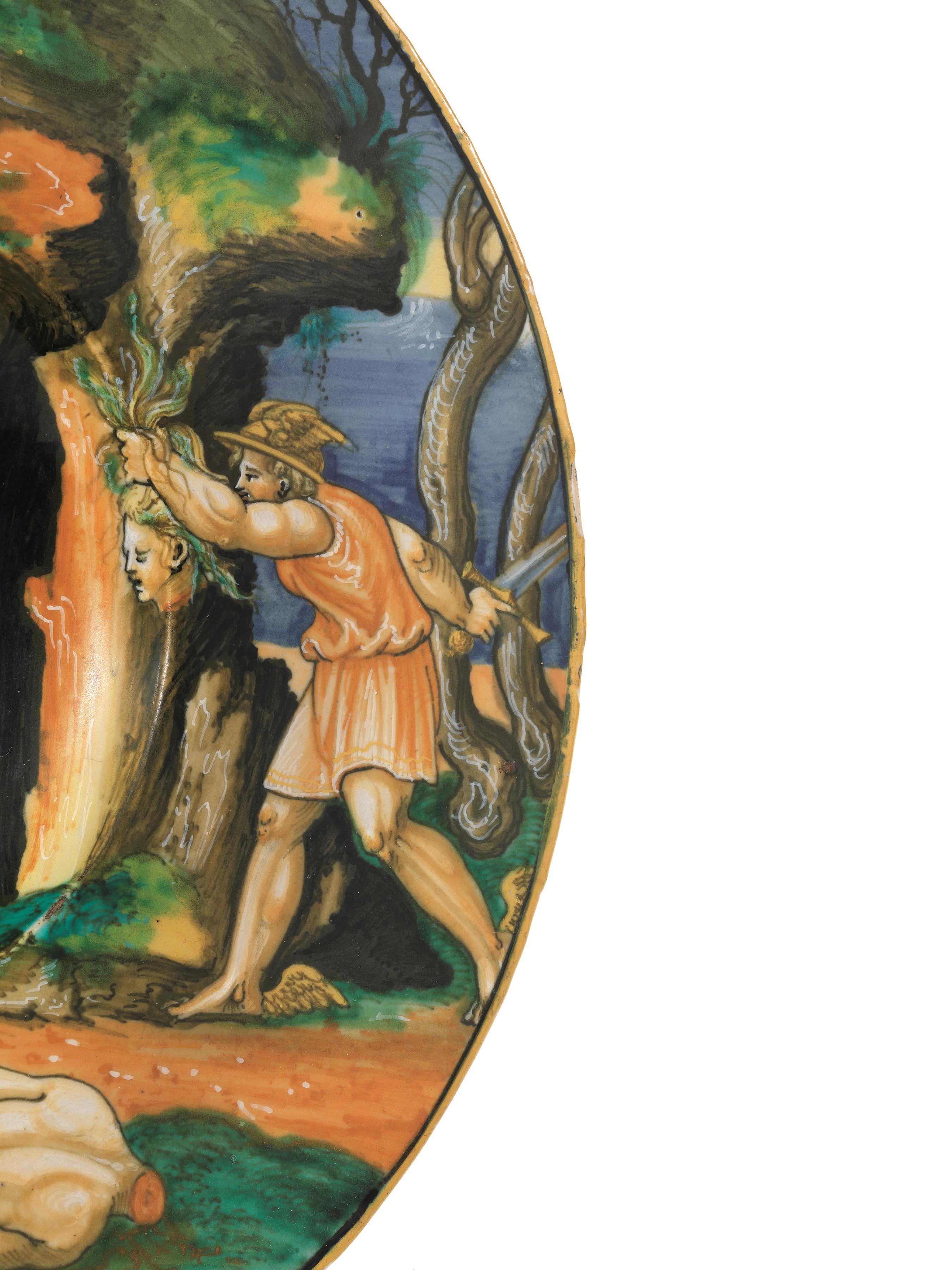 Con la consueta capacità pittorica, il pittore rodigino sintetizza la vicenda di Perseo (Ovidio, Met. IV, 769-803), uno dei miti più articolati della grecità, unendo, come spesso accade, in una stessa narrazione i personaggi mutuati da più incisioni. Il momento topico è nell’esergo in primo piano: la morte di Medusa, il mostro femminile, con il capo coperto di vipere il cui sguardo era in grado di pietrificare il nemico, che giace con il capo mozzato su un prato erboso in prossimità di uno specchio d’acqua; il modello del corpo è tratto da un’incisione di Jacopo (o Gian Giacomo) Caraglio (1500-1565 circa) ripresa da Rosso Fiorentino raffigurante Il convegno tra le Muse e le Pieridi. A destra, Perseo – il capo coperto dall’elmo che rende invisibili e ai piedi i calzari alati dono di Ermes – avanza brandendo la spada e portando con sè la testa di Medusa; la figura qui utilizzata per rappresentare l’eroe è stata spesso usata dal pittore ed è presente anche in altre opere, e si tratta di un adattamento dall’incisione raffigurante il Martirio di Santa Felicita di Marcantonio Raimondi tratta da Raffaello. Al centro, un giovane personaggio spunta da dietro una roccia portando un sacco sulle spalle; il personaggio, anch’esso utilizzato di frequente da Xanto Avelli, è derivato dall’incisione di Marcantonio Raimondi raffigurante Isacco che benedice Giacobbe, ugualmente tratta da Raffaello. Riteniamo che si tratti di un episodio successivo: Perseo trasporta la testa della Gorgone all’interno di un sacco di cui Atena gli ha fatto dono insieme allo scudo utilizzato per ingannare Medusa, allo scopo di evitare lo sguardo del mostro, il cui potere pietrificante non sarebbe venuto meno neanche dopo la morte della stessa.