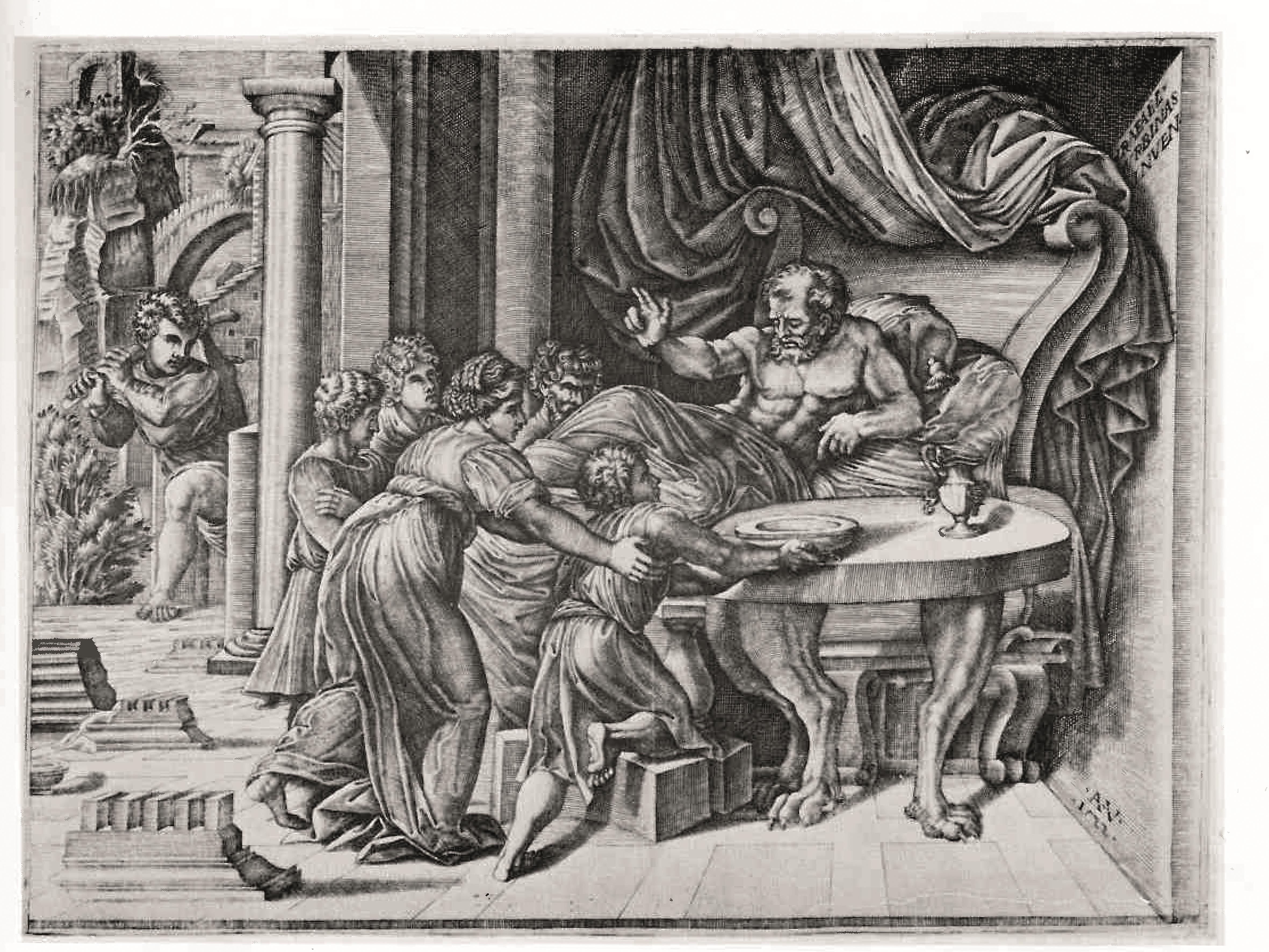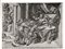 A sinistra, vicino a un palazzo, un uomo si copre il volto con un mantello. L’episodio potrebbe essere quello in cui Perseo, di ritorno dalle sue avventure, reca la testa promessa a Polittete per le nozze con la madre e per vendicarsi dei torti subiti la estrae per l’ultima volta dalla sacca pietrificando il re e i suoi cortigiani: “a danno per il reo”.