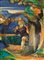 La scena figurata si svolge in primo piano tra un edificio, a sinistra, e due alberelli dal tronco sinuoso, a destra; al centro è resente un’alta rupe coperta da zolle erbose. Sullo sfondo un paesaggio costiero con un borgo circondato da mura e un’alta collina squadrata; un fiume lo separa dalla scena in primo piano.