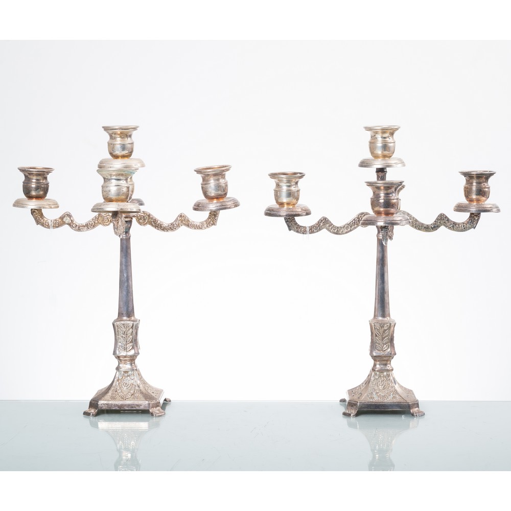COPPIA DI CANDELABRI a cinque fiamme in metallo argentato.