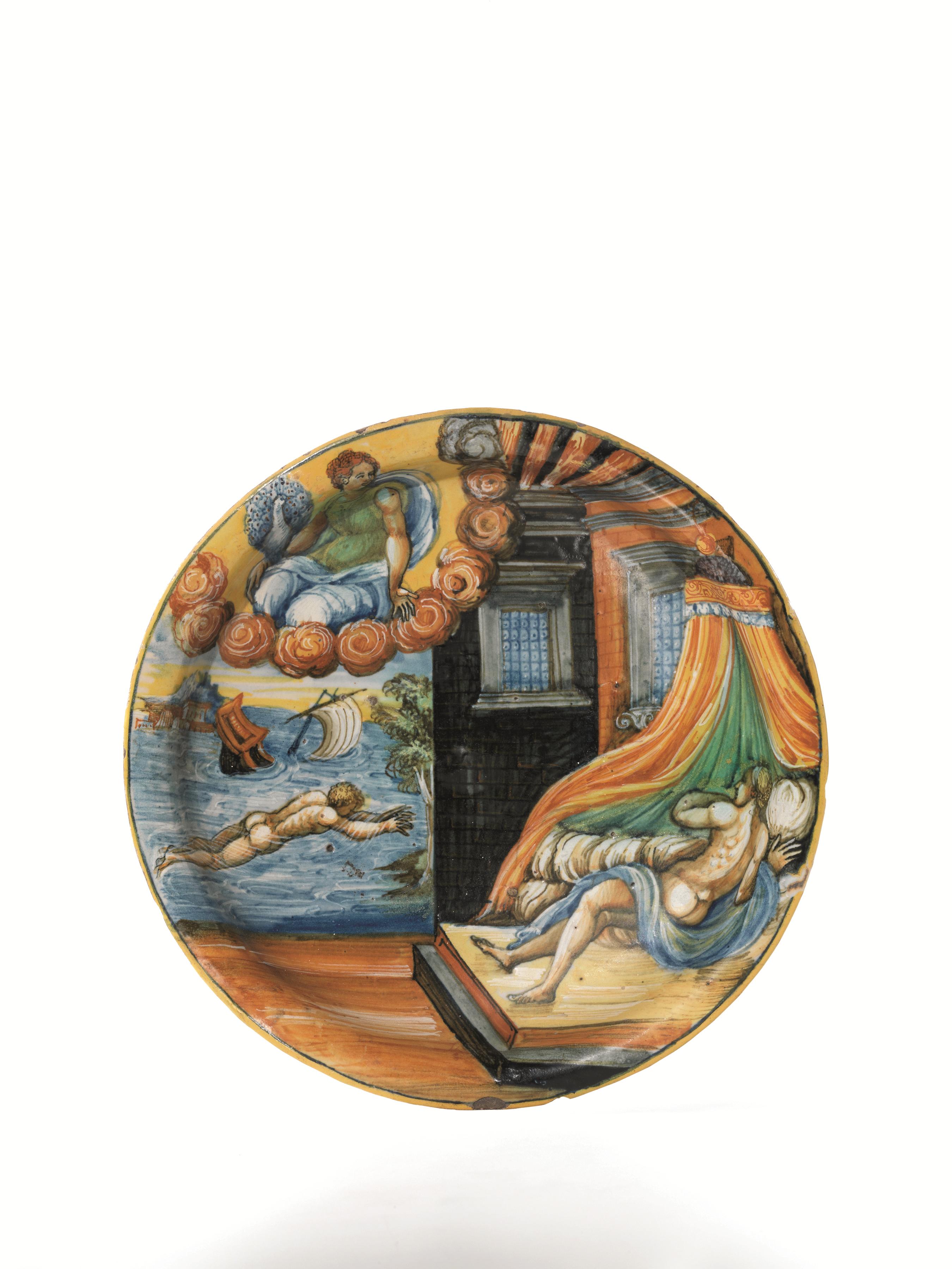 Il soggetto, tratto dalle Metamorfosi di Ovidio (Ov., Met. XI, vv. 592-749), non è tra quelli più frequentemente riprodotti nelle opere in maiolica, ma si conosce tuttavia un bellissimo piatto con il medesimo soggetto e la stessa frase dipinto da Francesco Xanto Avelli.