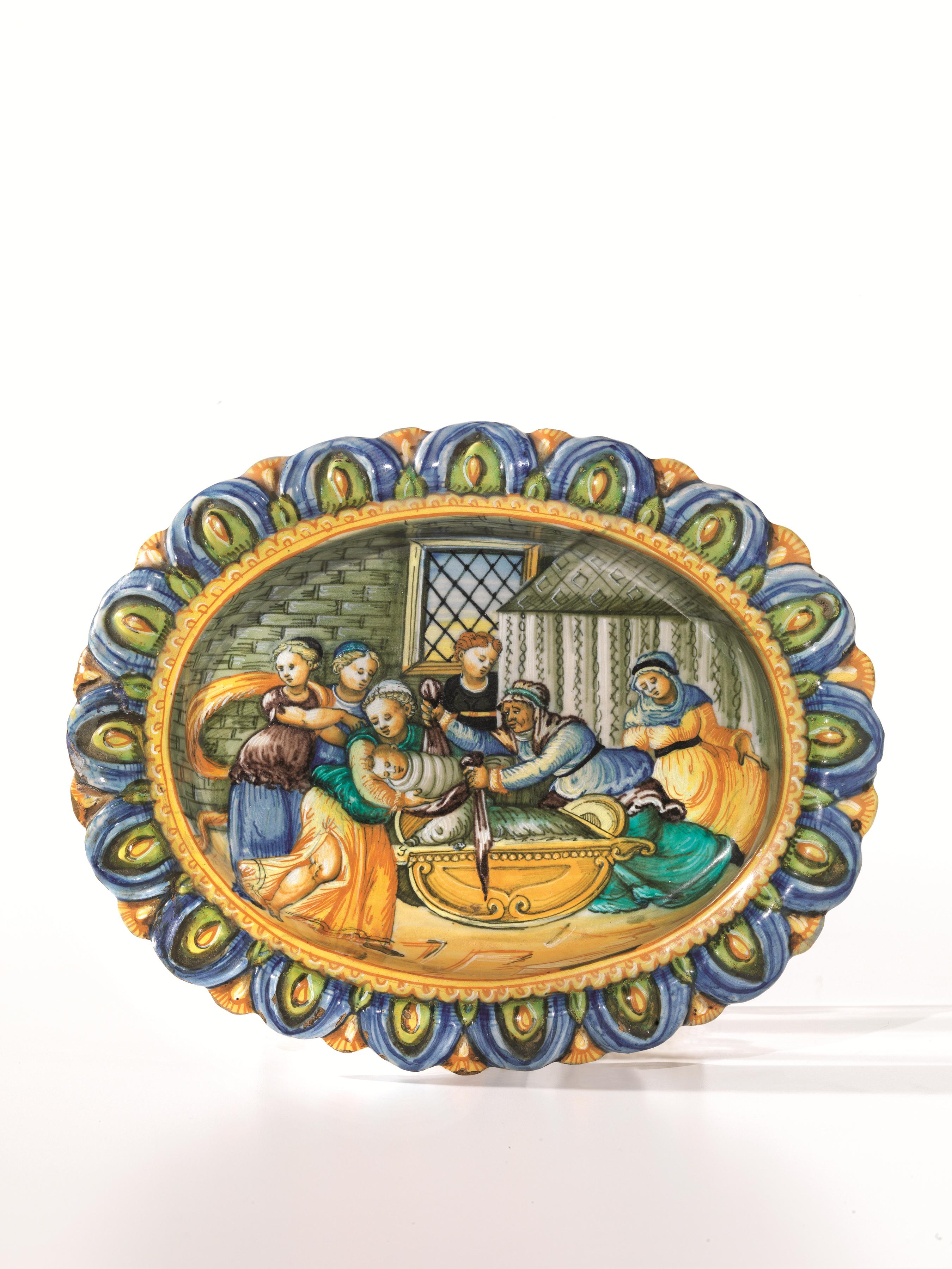 Ma è nel confronto con un’opera simile della bottega Fontana, già appartenuta alla collezione Adda, che riscontriamo le affinità maggiori: nella coppa da impagliata le figure femminili, intente ad accudire una puerpera coricata in un letto con baldacchino, mostrano la stessa pacatezza nei volti che vediamo nelle donne rappresentate sulla nostra opera, e anche la tenda ha il medesimo motivo decorativo. In particolare sono utili nel confronto le caratteristiche stilistiche del verso dell’oggetto: il piccolo putto mostra molte analogie stilistiche con il giovane angelo sul retro del nostro tagliere e anc