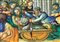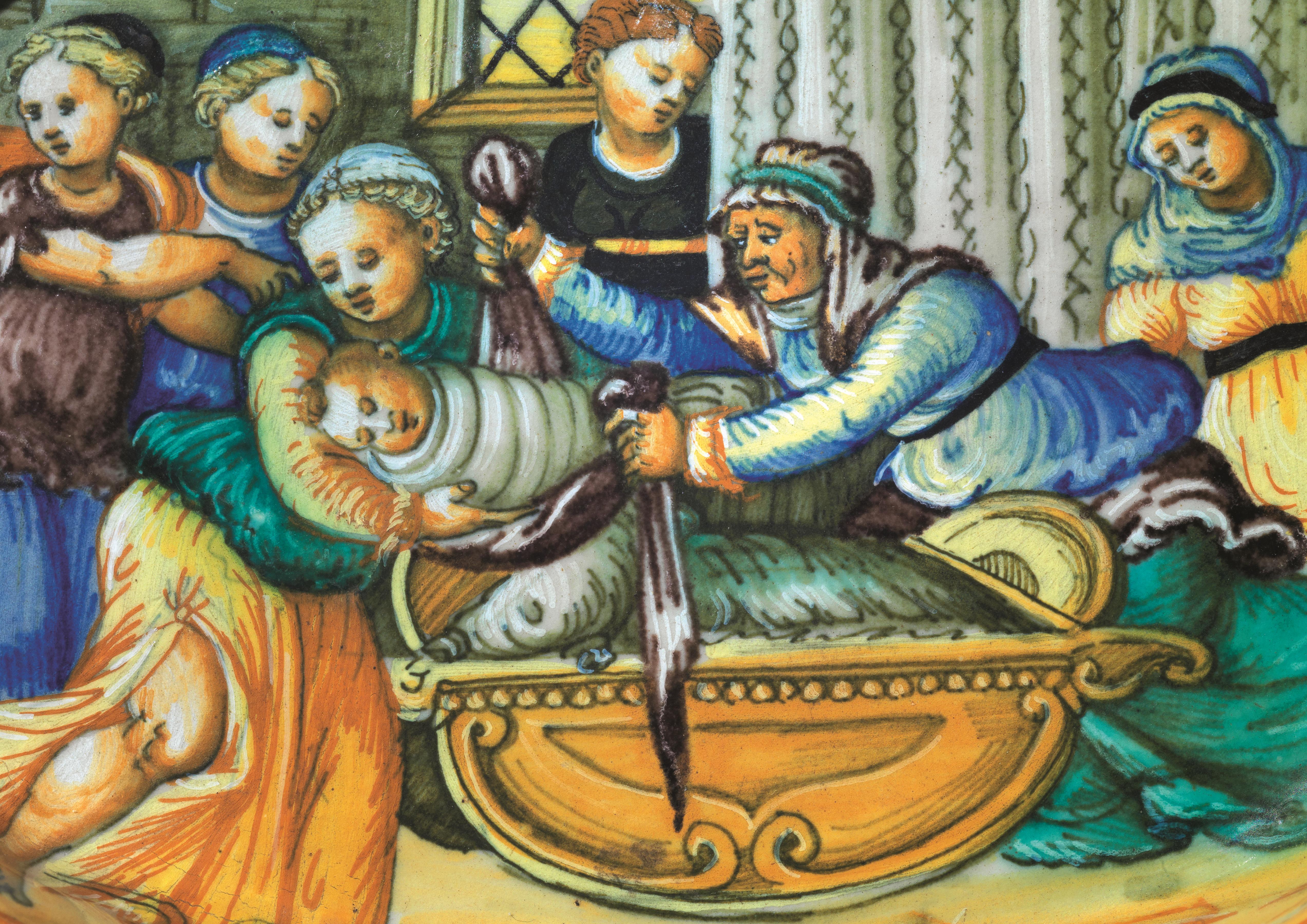 Il decoro in piena policromia interessa l’intera superficie con una scena animata da nutrice e balie indaffarate presso la culla, intente a fasciare il neonato.