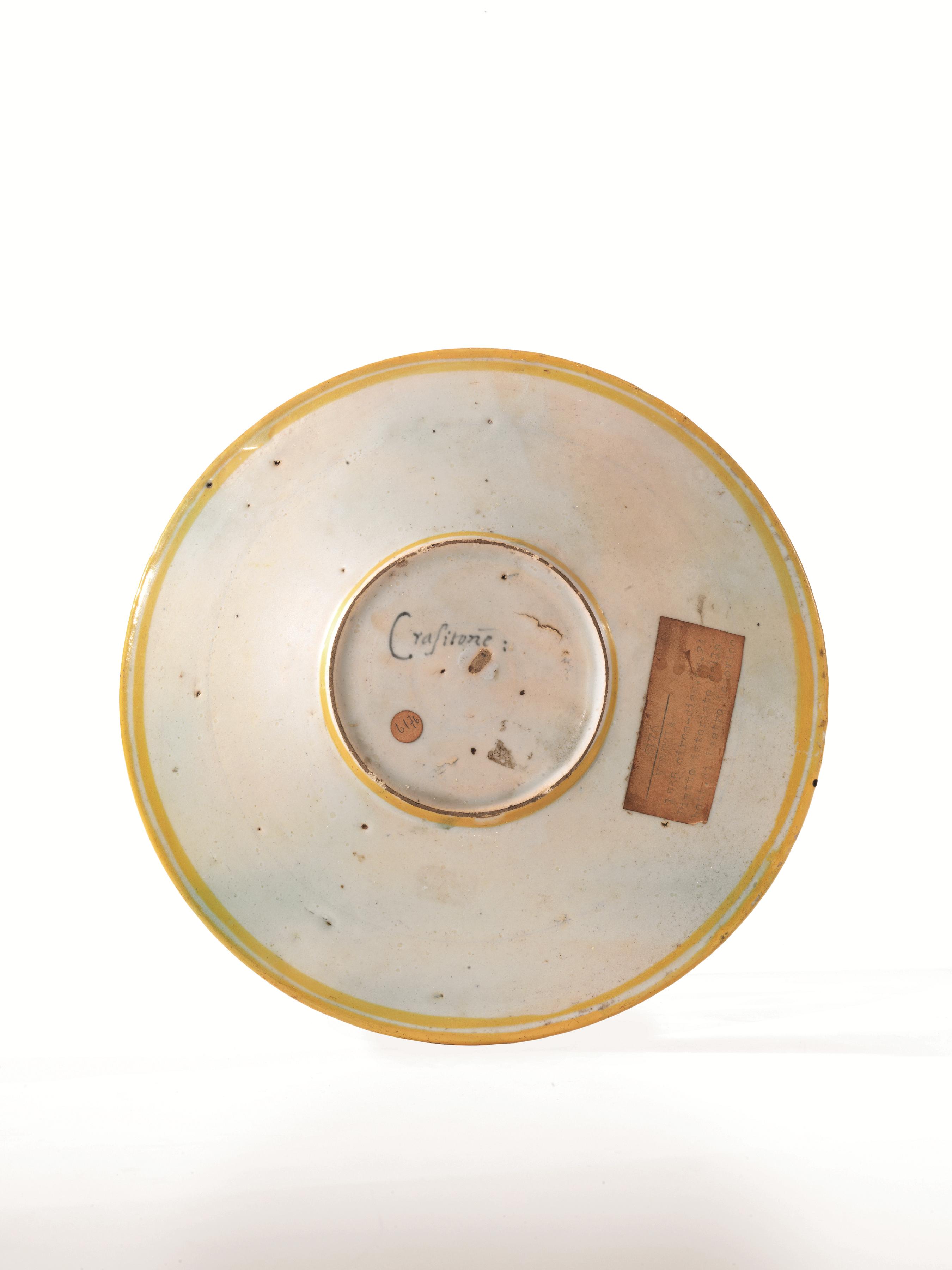 Sul retro, ove i profili del piatto sono sottolineati da linee gialle, al centro del cavetto si legge la parola “Crasitone”, delineata in corsivo in bruno di manganese.