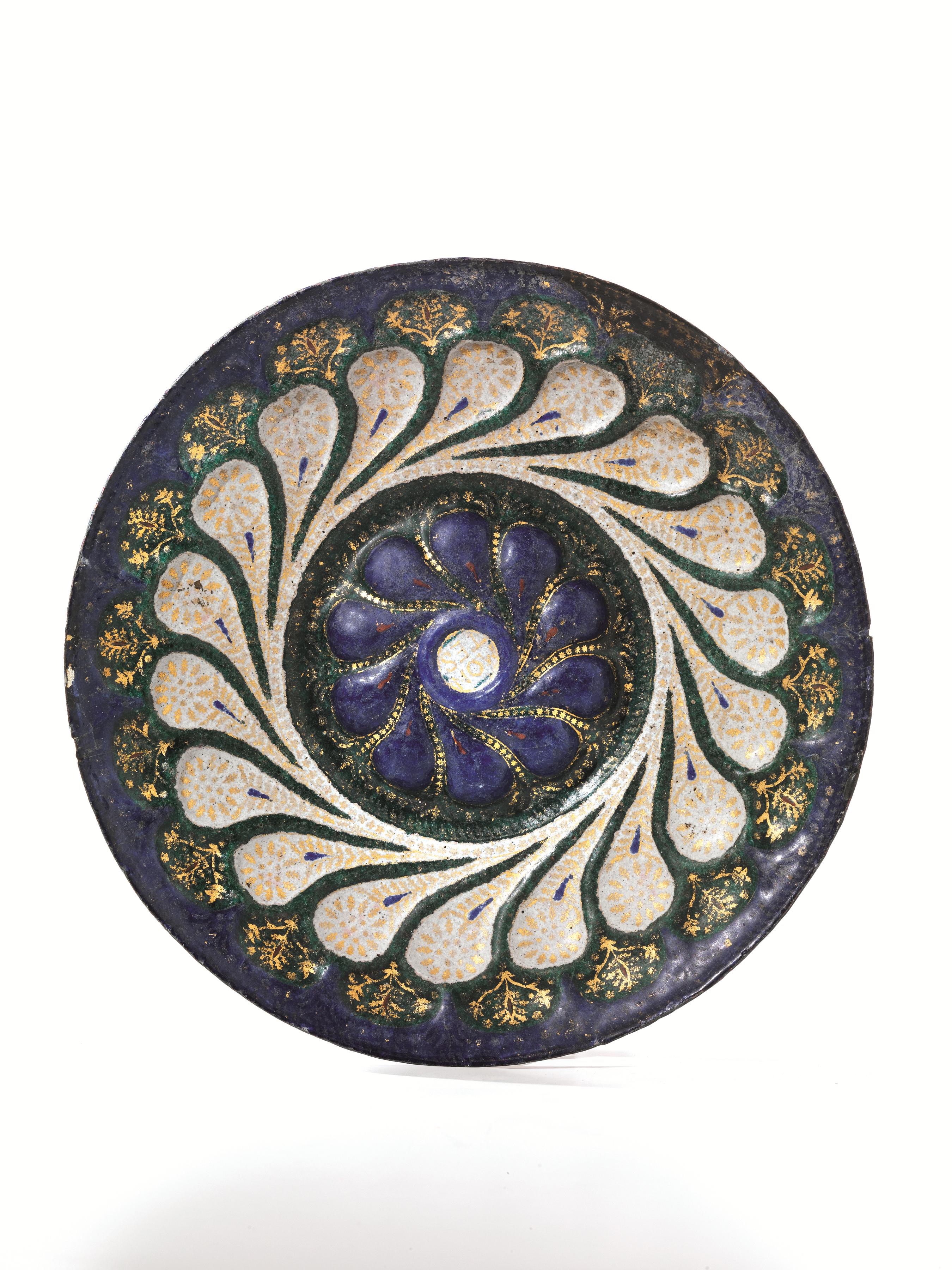 La tipologia del nostro piatto appartiene al secondo periodo di produzione, quando fu introdotta una nuova tecnica a smalto: questa prevedeva una prima copertura degli oggetti in rame con smalto bianco e la loro cottura, alla quale seguiva la vera e propria decorazione con una successiva applicazione degli strati colorati, in genere in blu e verde, e quindi una nuova cottura a temperature differenti; seguiva infine l’applicazione degli ornati dorati.