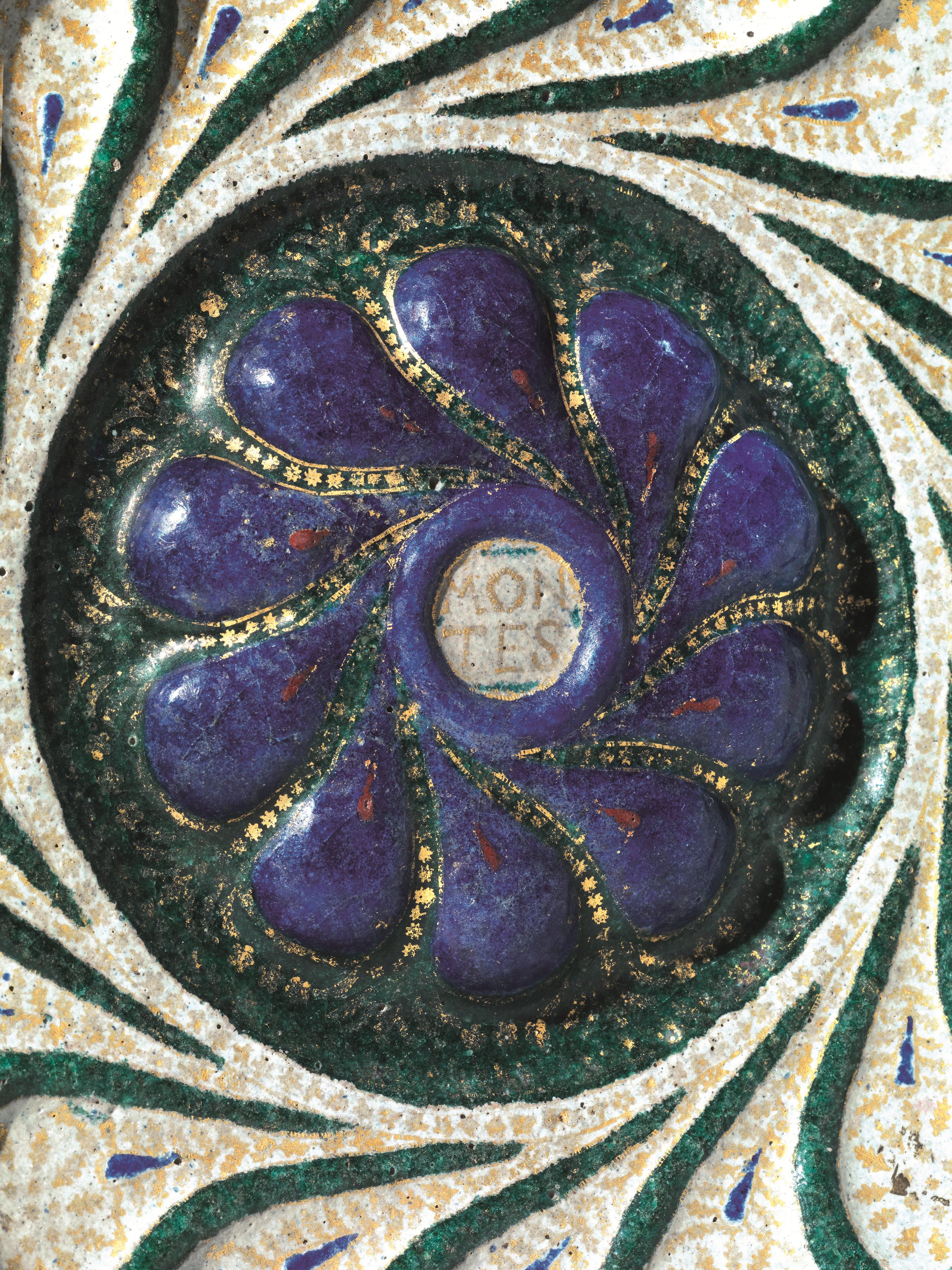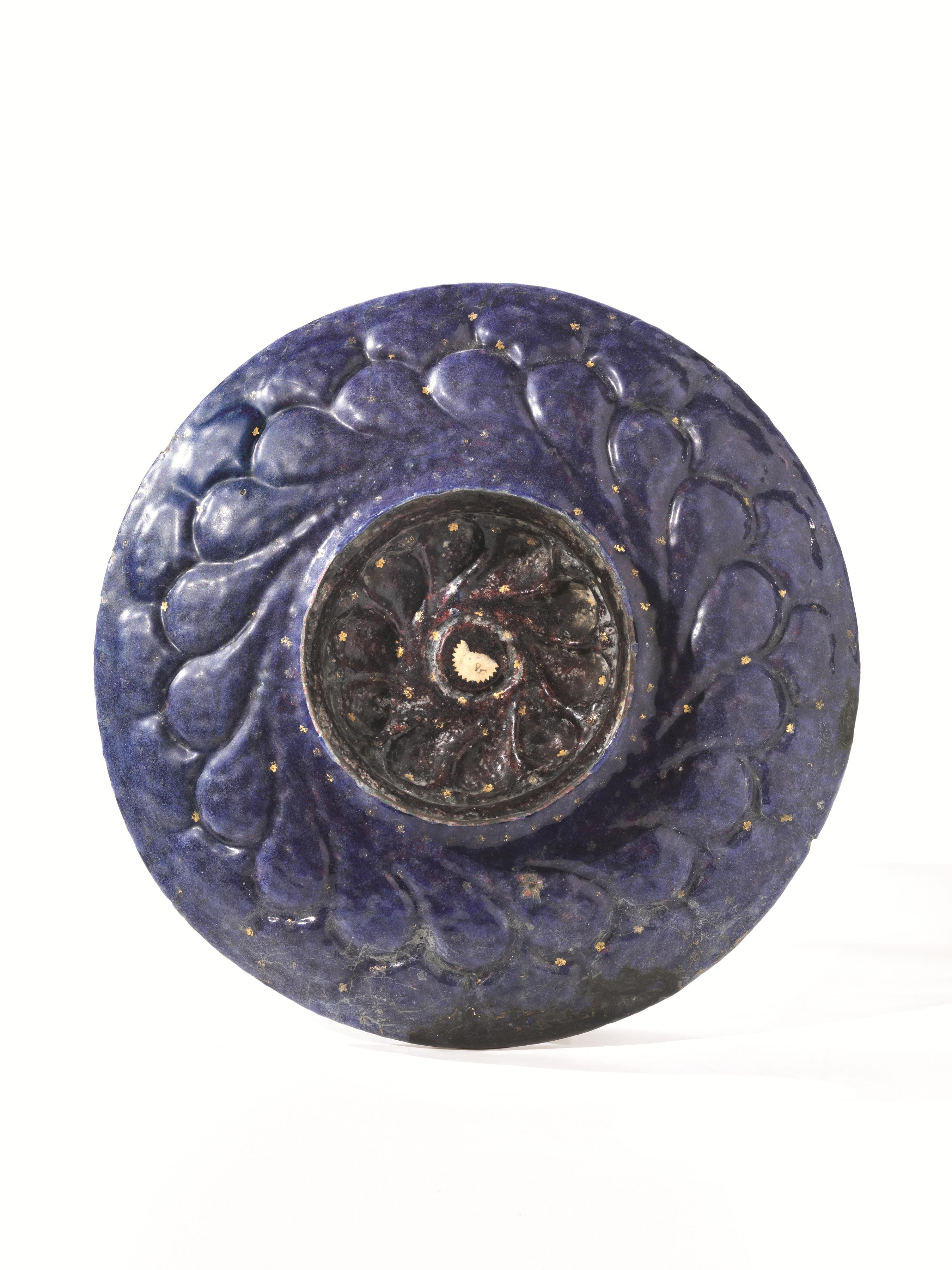 Il retro della coppa è interamente ricoperto di smalto blu cobalto, salvo una porzione, al di sotto del piede, dove si intravvede il rame sotto uno strato sottile di vetro. Il blu intenso è decorato con piccole stelline dorate dipinte a fasce concentriche nelle incavature delle baccellature e, con maggior concentrazione, lungo l’attaccatura del piede. Le stesse stelline sono presenti anche all’interno del piede.