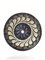 La coppa in rame umbonata ha forma circolare con voluta centrale a baccellature rilevate e arcuate disposte attorno al centro, delimitato da una cornice a rilievo d’ispirazione ispano-moresca. La tesa mostra una fascia a baccellature concave delimitate da parti a rilievo in una generale disposizione che alterna pieni e vuoti. Le volute bianche, anch’esse con forma incurvata, si estendono sulla superficie incorniciate da una serie di petali dalla forma a larga goccia, che adornano l’orlo alto con labbro arrotondato, su smalto verde scuro. Il centro, incorniciato di blu, reca la scritta dorata “MONTES” su fondo bianco. Le baccellature arcuate della tesa, a imitazione delle penne di pavone, mostrano il colore di fondo bianco con lumeggiature blu e sottili tocchi d’oro disposti a piccoli fiorellini. La forma è sottolineata dallo smalto verde, che prosegue fino a riempire l’ultima fascia di baccellature, dove il decoro in oro assume le sembianze di un piccolo cespuglio centrato da un tocco di rosso. Il blu conclude l’ornato sull’orlo, mostrando tracce della doratura originaria.