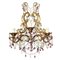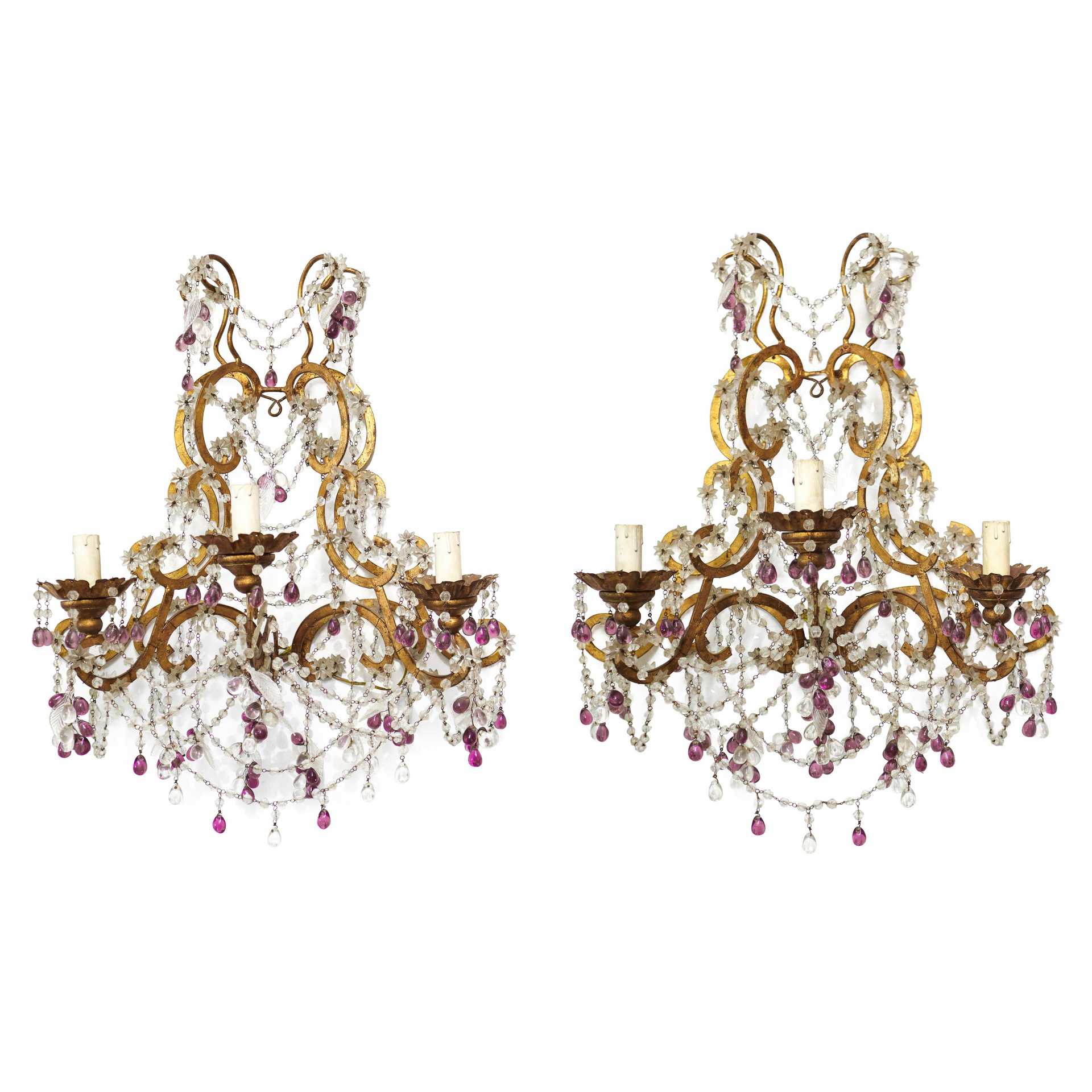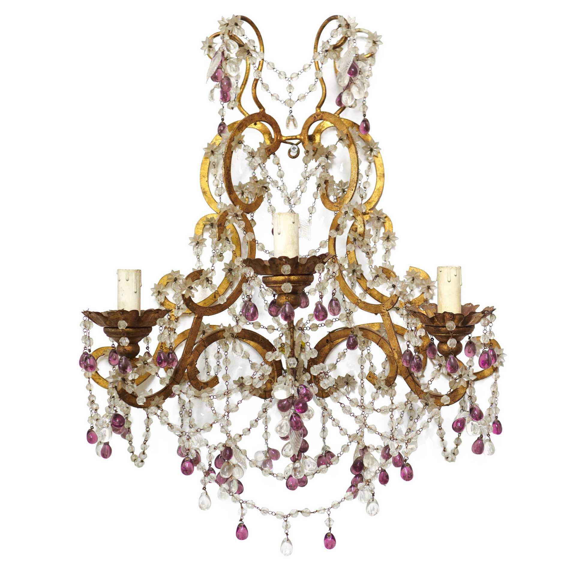 Coppia di appliques in metallo dorato con brindoli in vetro a sfere e fiori bianchi e ametista a tre luci