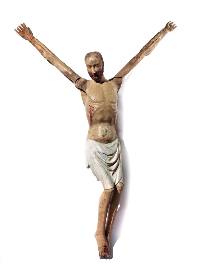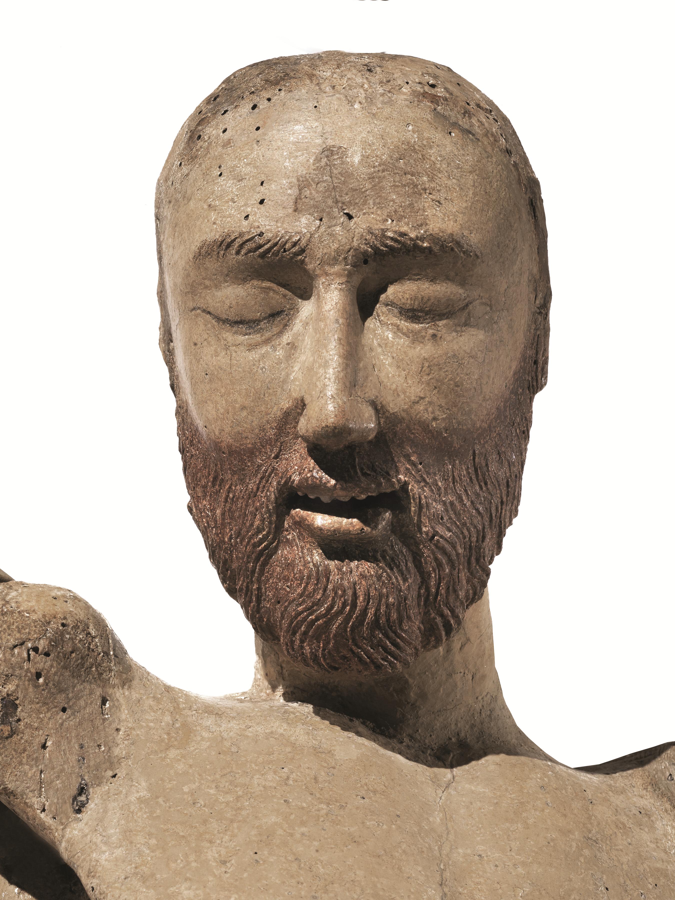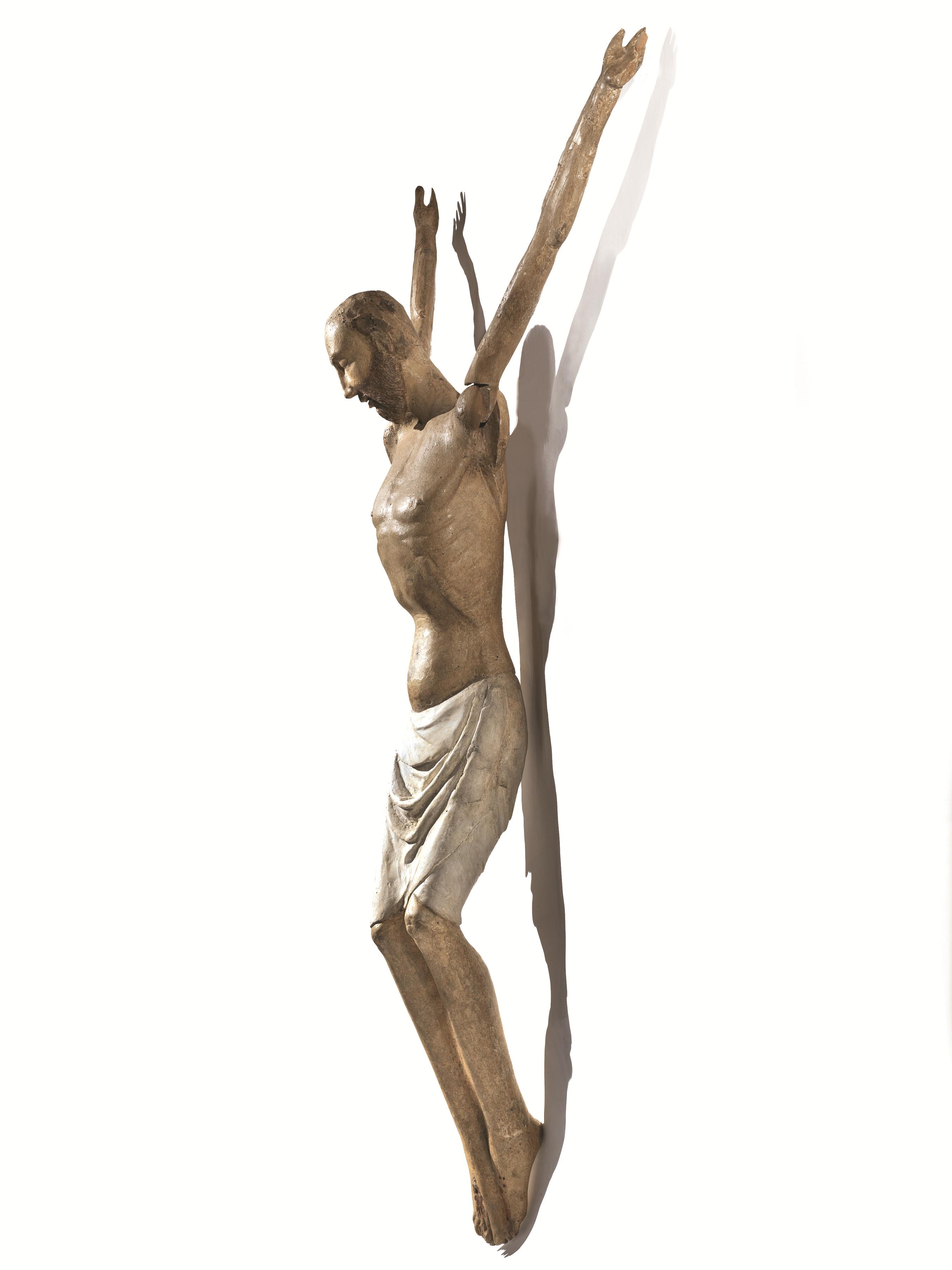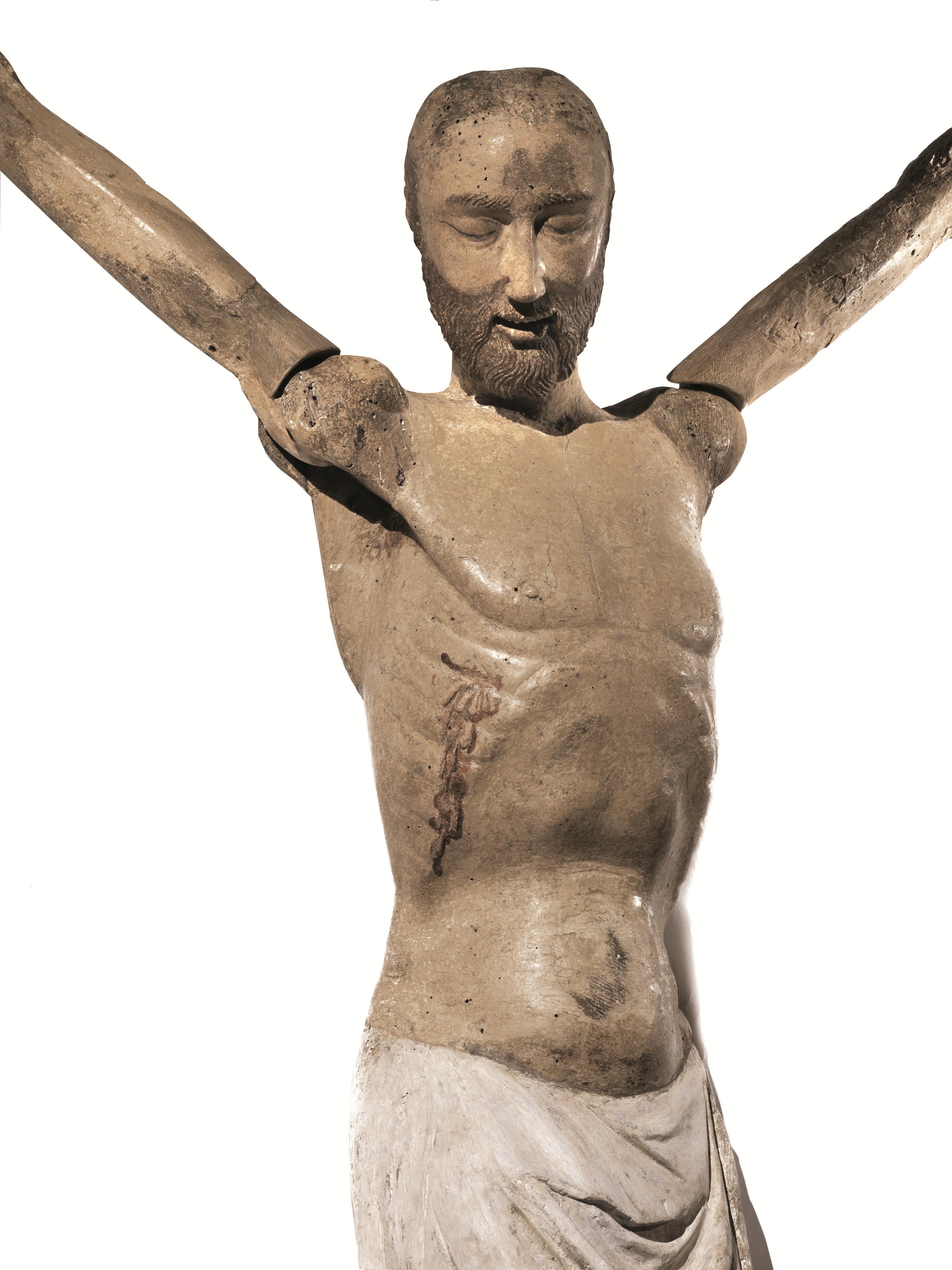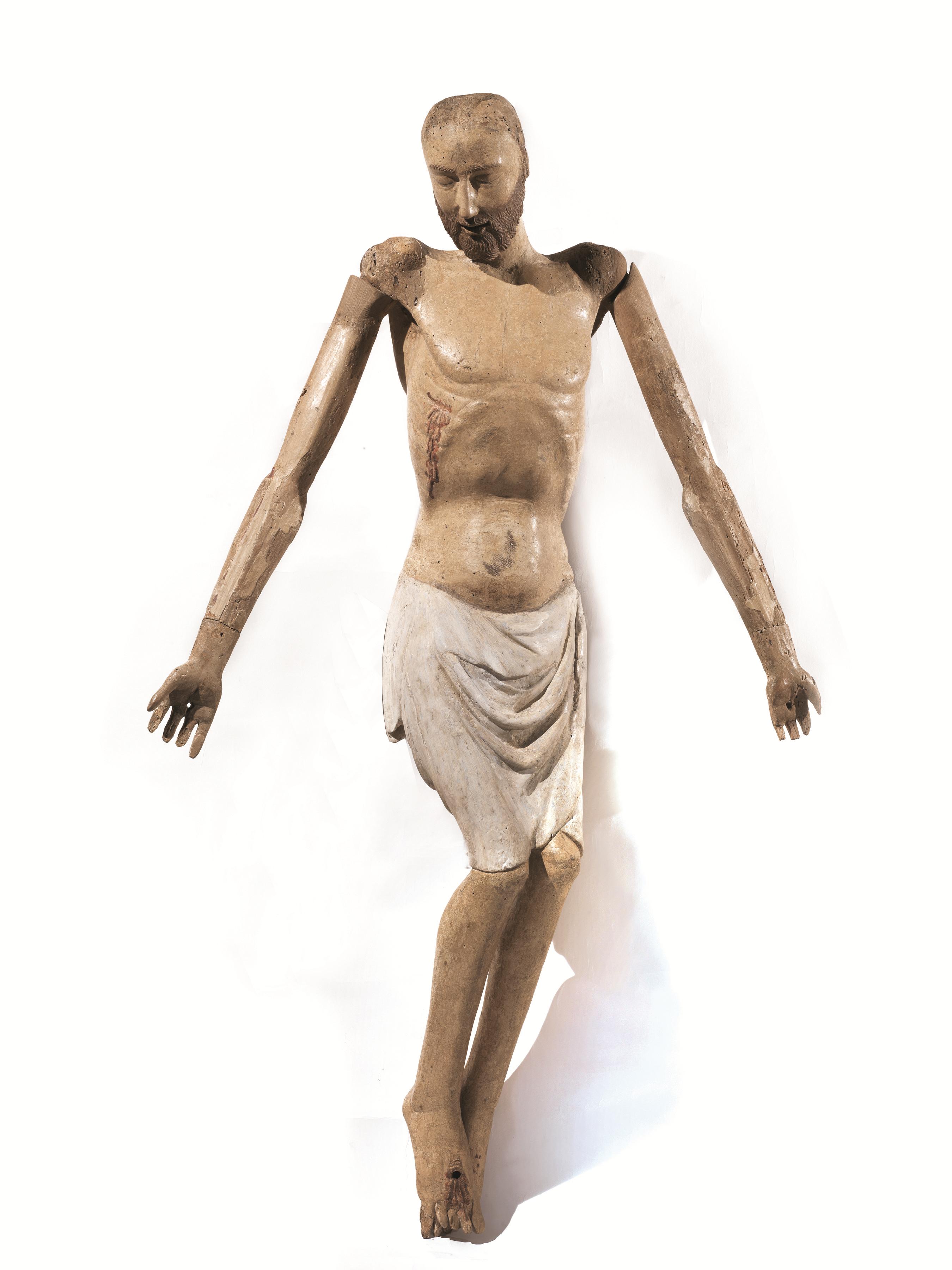 La sagoma snella del Crocifisso è scolpita a tutto tondo in un unico massello di legno da frutto, forse pero, ma la consueta iconografia del soggetto si avvale di braccia reclinabili volte a garantirne la duplice funzione di Cristo deposto. Senz’altro riconducibile al contesto figurativo di ambito toscano di cui tratteremo oltre nel dettaglio, quest’opera costituisce un significativo ritrovamento critico per aggiornare il corpus superstite dei simulacri centroitaliani di età gotica impiegati nella liturgia collettiva del Venerdì Santo. Durante tale celebrazione non si sarebbe assistito a una semplice riproposizione scenica del Dramma, bensì a una ritualità di grande coinvolgimento emozionale garantita dalla recitazione delle cosiddette Lamentazioni mariane. L’esito, infatti, era quello di sacre rappresentazioni teatrali basate su dialoghi derivati dall’uso popolare della Lauda e dal Planctus di tradizione latina, assecondando peraltro la tendenza del rinnovamento spirituale che già pervase profondamente il XIII secolo, in particolare grazie alla crescente affermazione di ordini mendicanti come Francescani e Domenicani, nonché di pari passo col dilagare delle numerose confraternite. Una volta sfilati i chiavelli delle mani e dei piedi, l’immagine scolpita del Cristo doveva essere rimossa simbolicamente dalla croce - ormai dispersa ma si può presumere che corrispondesse al tronco dell’Arbor Vitae -, provvedendo dunque ad adagiare gli arti superiori lungo i fianchi per simularne la tumulazione nel sepolcro. Il meccanismo primitivo era garantito dagli alloggiamenti ricavati nelle spalle e dall’innesto-cardine delle braccia fissato da semplici perni lignei. Il ripetersi secolare di questa pratica compromise però il movimento stesso fino a danneggiare irrimediabilmente le zone più esposte, tra cui le mani e parte degli avambracci, sostituiti da un restauro ottocentesco con rifacimenti più grossolani. È invece probabile che l’eliminazione delle orecchie e della capigliatura - forse dapprima folta al pari della barba quasi rossiccia e intagliata con ciocche che dovevano sfiorare le spalle -, la riscalpellatura della calotta, così come la variazione della pendenza del capo, siano imputabili all’accomodamento per una parrucca di capelli veri, espediente realistico molto frequente dopo i nuovi precetti liturgici della Controriforma. Il recente restauro conservativo, condotto nel 2008 a Oriago di Mira presso il laboratorio di restauro di Giovanna Menegazzi e Roberto Bergamaschi, ha pertanto eliminato le incrostazioni delle varie ridipinture che occultavano la pregevole sensibilità plastica dell’anatomia, valorizzando la tonalità avorio dell’incarnato e confermando che la versatilità tipologico-funzionale di cui l’opera si fa interprete era stata prevista fino dal principio. Alla luce degli aspetti descritti è stato altresì ritenuto opportuno procedere al delicato ripristino filologico dell’antico meccanismo mobile. Ciò ha consentito il naturale svasamento a “V” delle braccia verso l’alto, mentre il perizoma - pervenuto privo della colorazione iniziale salvo minimi frammenti di blu presenti sulle terga - è stato uniformato da una sottile imprimitura di gesso reversibile.