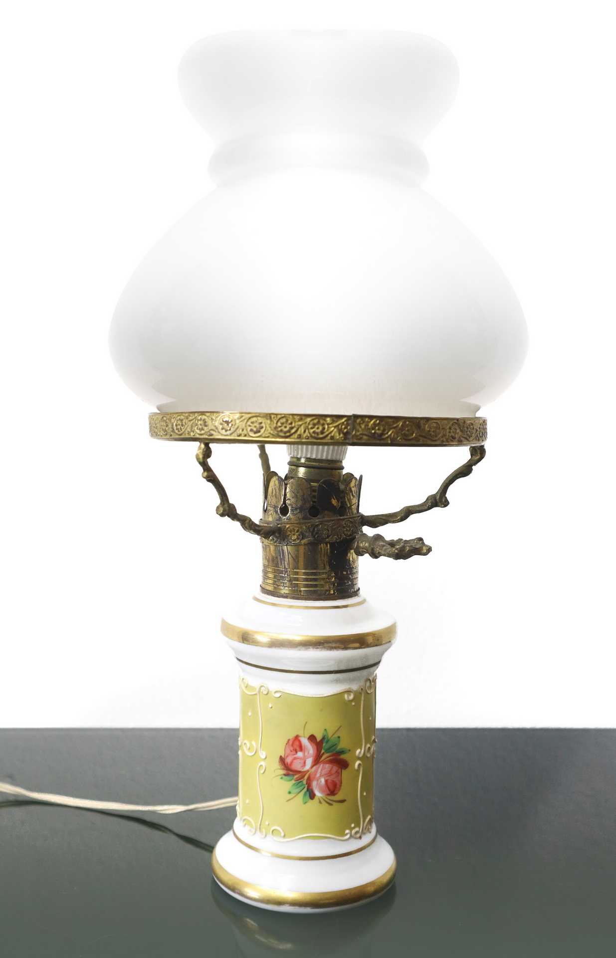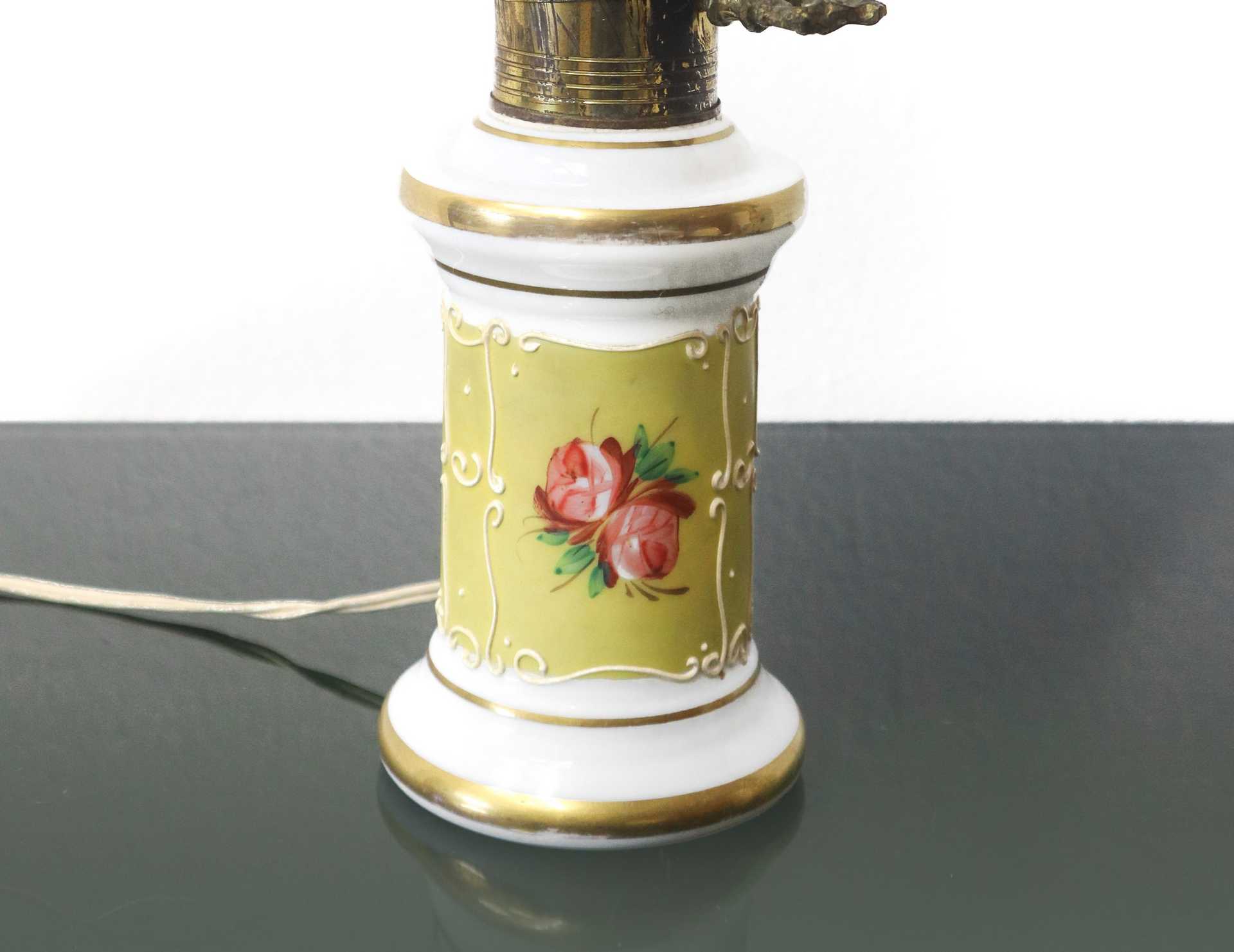 Piccolo lume con base in porcellana e coppa in opaline, C