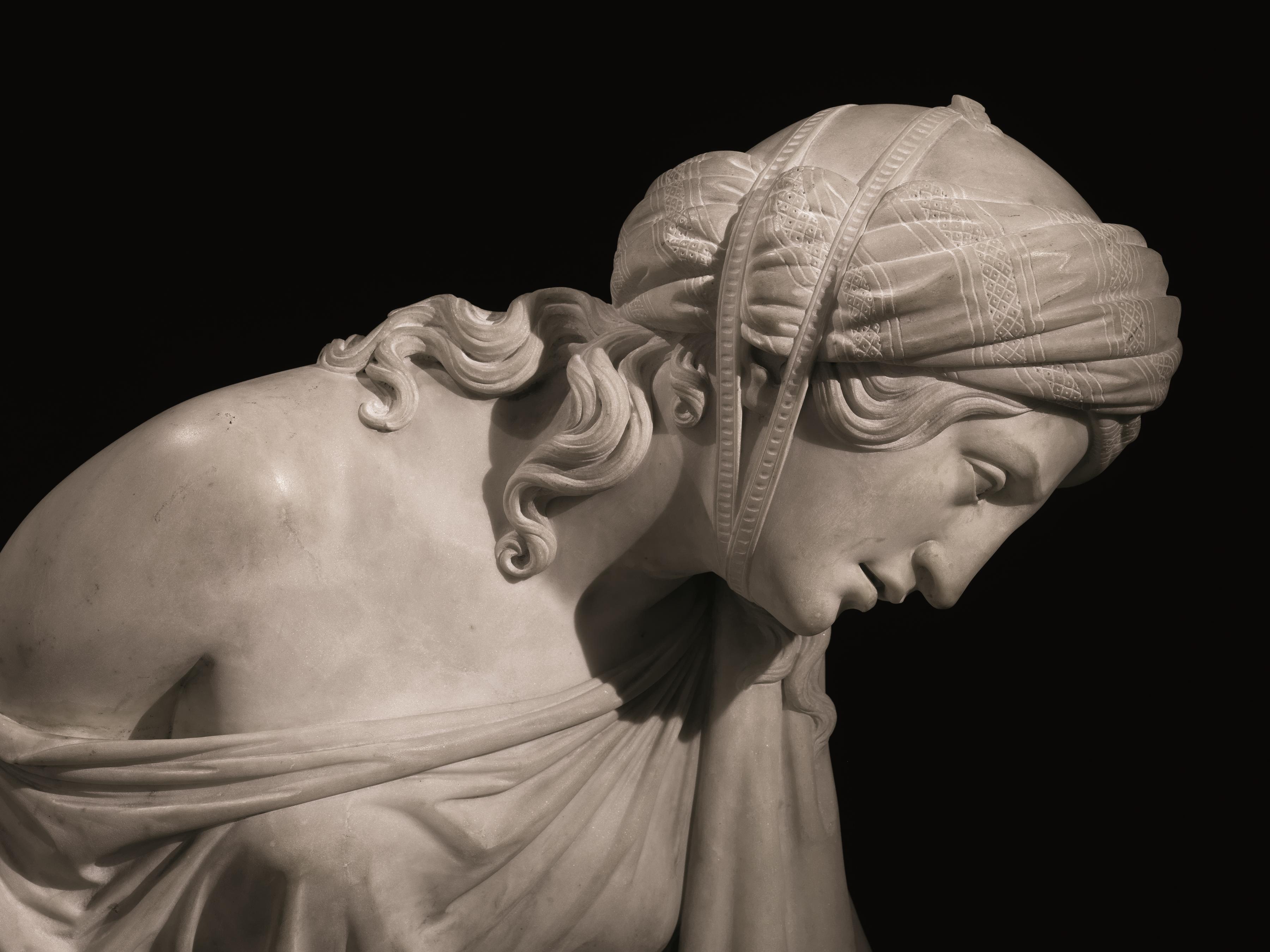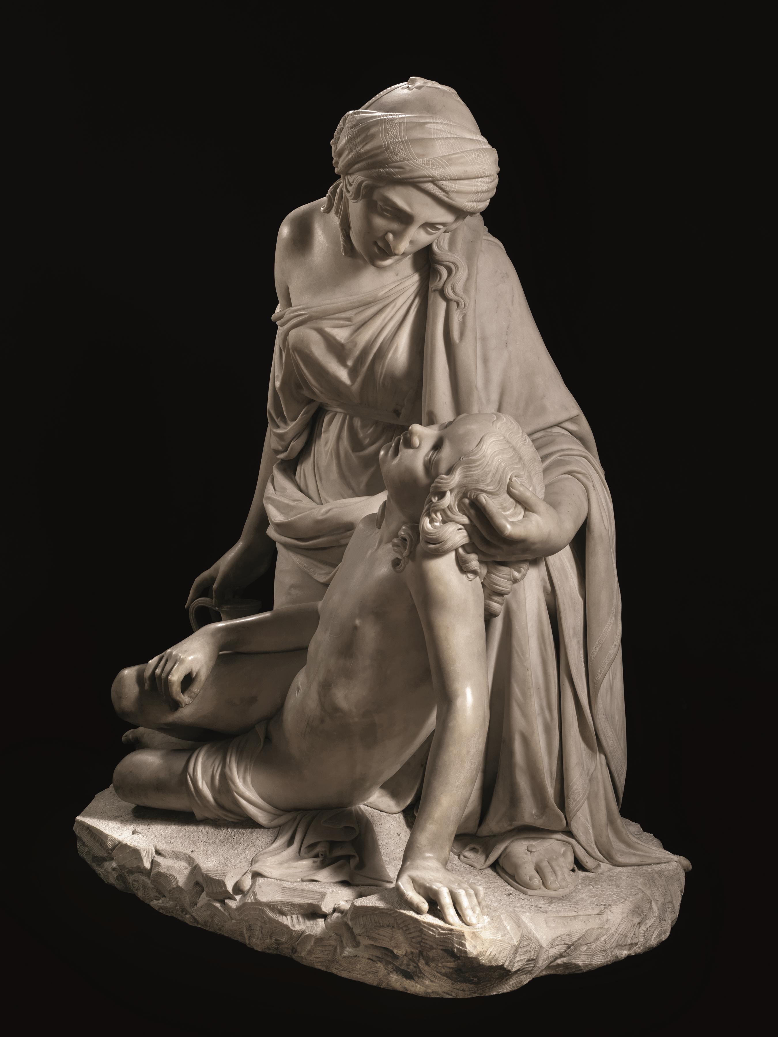 Come doveva essere avvenuto nel Concorso accademico del 1840, anche qui Caselli sembrava volersi confrontare con Dupré, in questo caso non nello stesso soggetto, ma nel motivo della figura del fanciullo nudo: lui Ismaele, l’altro Abele. Nel cimento con quel capolavoro destinato ad una grande fortuna Caselli risulta comunque non sfigurare, per la sensibilità anatomica e la sensualità con cui ha saputo rendere il corpo di Ismaele che, sfinito dalla sete, appare sollevato su un fianco, mentre la madre Agar tiene sollevato il volto cui guarda, in una corrispondenza di amorosi sensi, con infinito affetto. Il giovane scultore ha dunque saputo rendere con grande intensità l’episodio biblico che, in quanto espressione di un dolore universale, aveva e continuava a godere di una grande popolarità. Era il dramma della madre che, finita l’acqua e vedendo il figlio morire, aveva perso con ogni speranza anche la fiducia in Dio. In un momento in cui la scultura prediligeva ancora il mito e comunque motivi ispirati all’antichità classica, Caselli, come Dupré, si rivolgeva invece alla Bibbia vista come fonte di temi più rispondenti alla sensibilità contemporanea. Dimostrando le sue capacità e la sua ambizione, lo scultore senese si misurava con un tema che aveva conosciuto una grande fortuna in pittura, con esempi celebri, come Guercino, Van Dyck e Batoni, per quanto riguarda gli antichi maestri, e come Horace Vernet, Ary Scheffer, Piccio e Overbeck, se pensiamo ai più celebri pittori contemporanei. Questo gruppo addirittura precede, se pensiamo che la sua prima redazione è del 1842, il dipinto Agar e Ismaele di Adeodato Malatesta, realizzato tra il 1845 e il 1859, per poi diventare, dopo un così lungo percorso creativo che aveva creato molta attesa, una delle opere più celebri di quegli anni. La singolarità della versione
