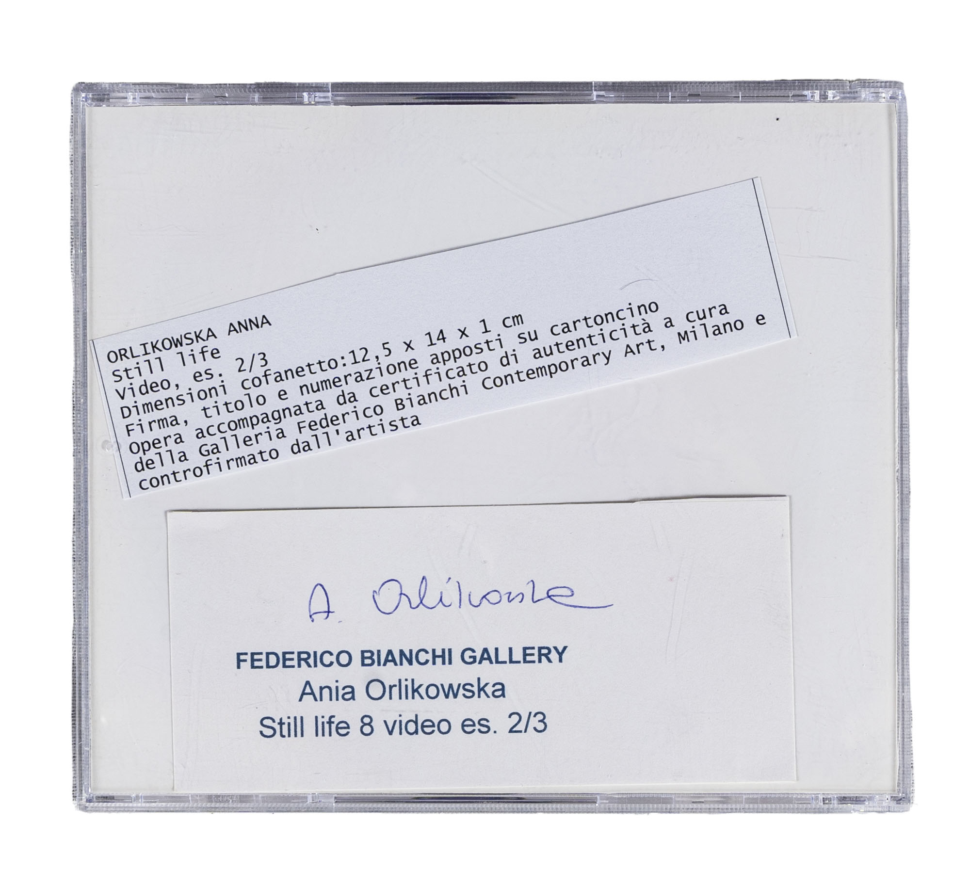 ANNA ORLIKOWSKA(1979)Still lifeVideo dvd, es. 2/3Firma, titolo e numerazione apposti su cartoncinoOpera accompagnata da certificato di autenticità a cura della Galleria Federico Bianchi Contemporary Art, Milano e firmato dall'artistaPROVENIENZA:Collezione privata, LeccoCollezione privata, Milano