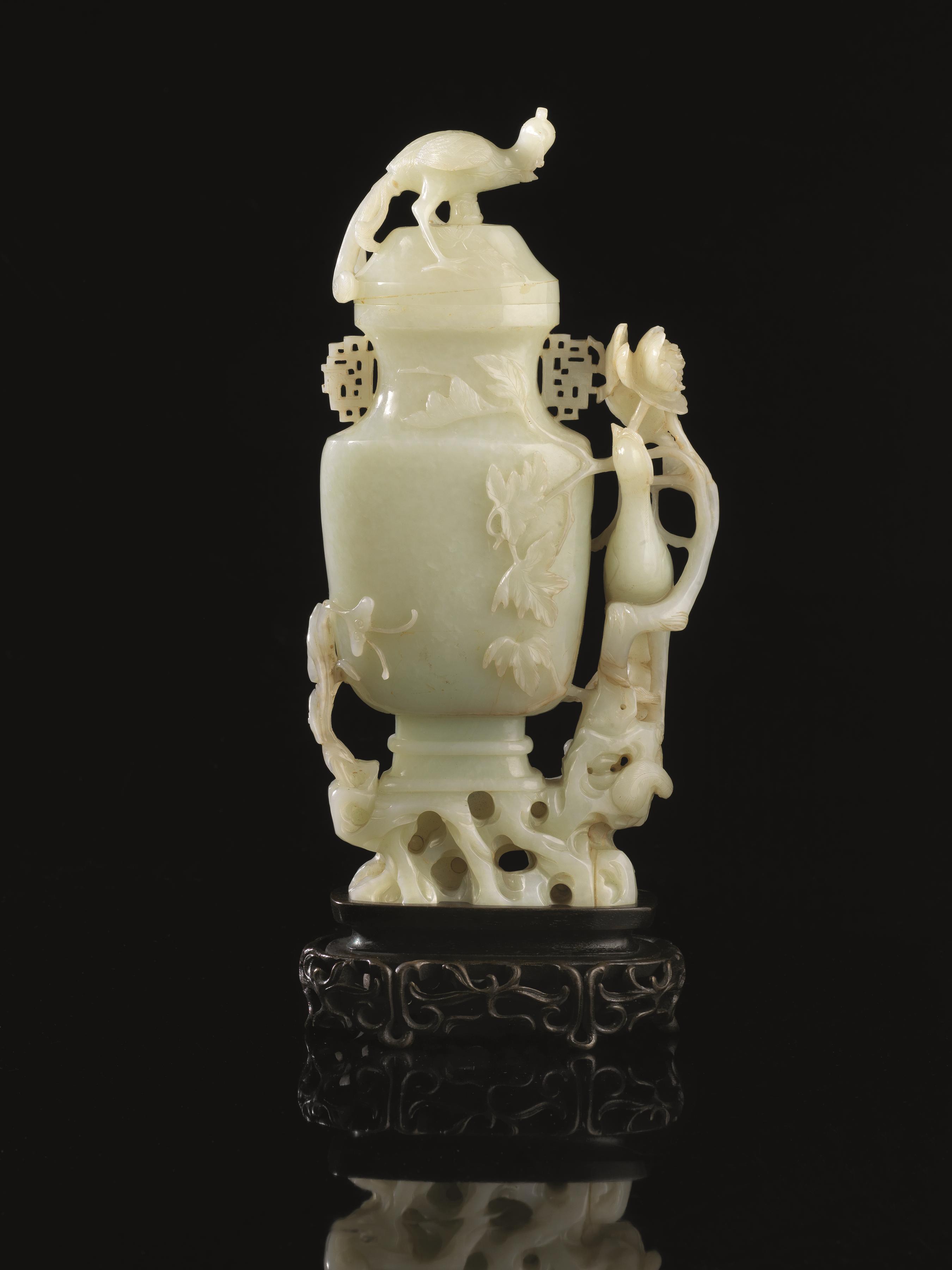 I volatili compaiono nell’arte cinese sin dalle dinastie Shang e Yin, ma la loro apparizione sulla giada risale al periodo Chou. I motivi decorativi del vaso, sono forse i più significativi e anche i più comuni della simbologia cinese e si adattano perfettamente alla bella qualità di questo vaso in giada.