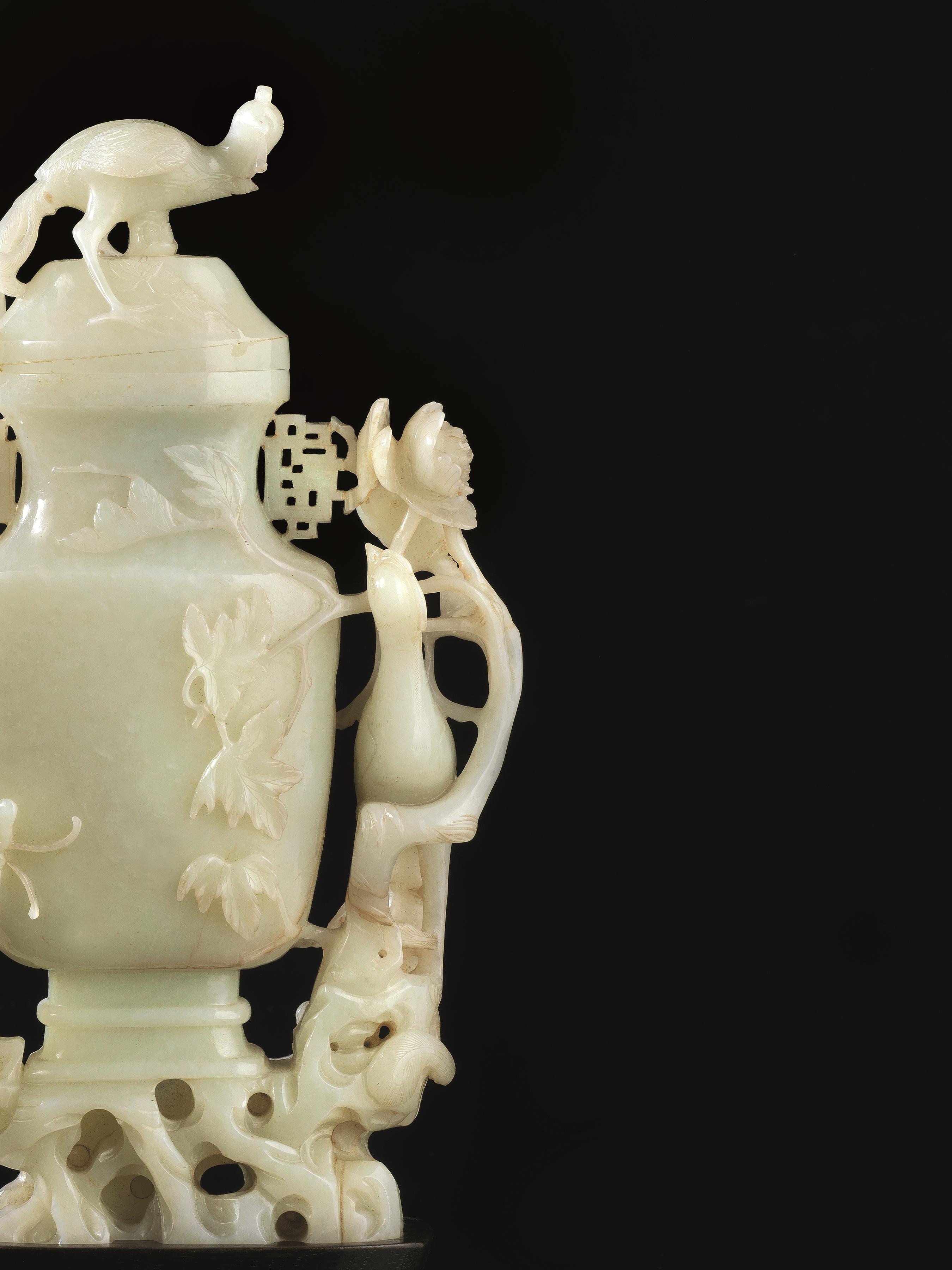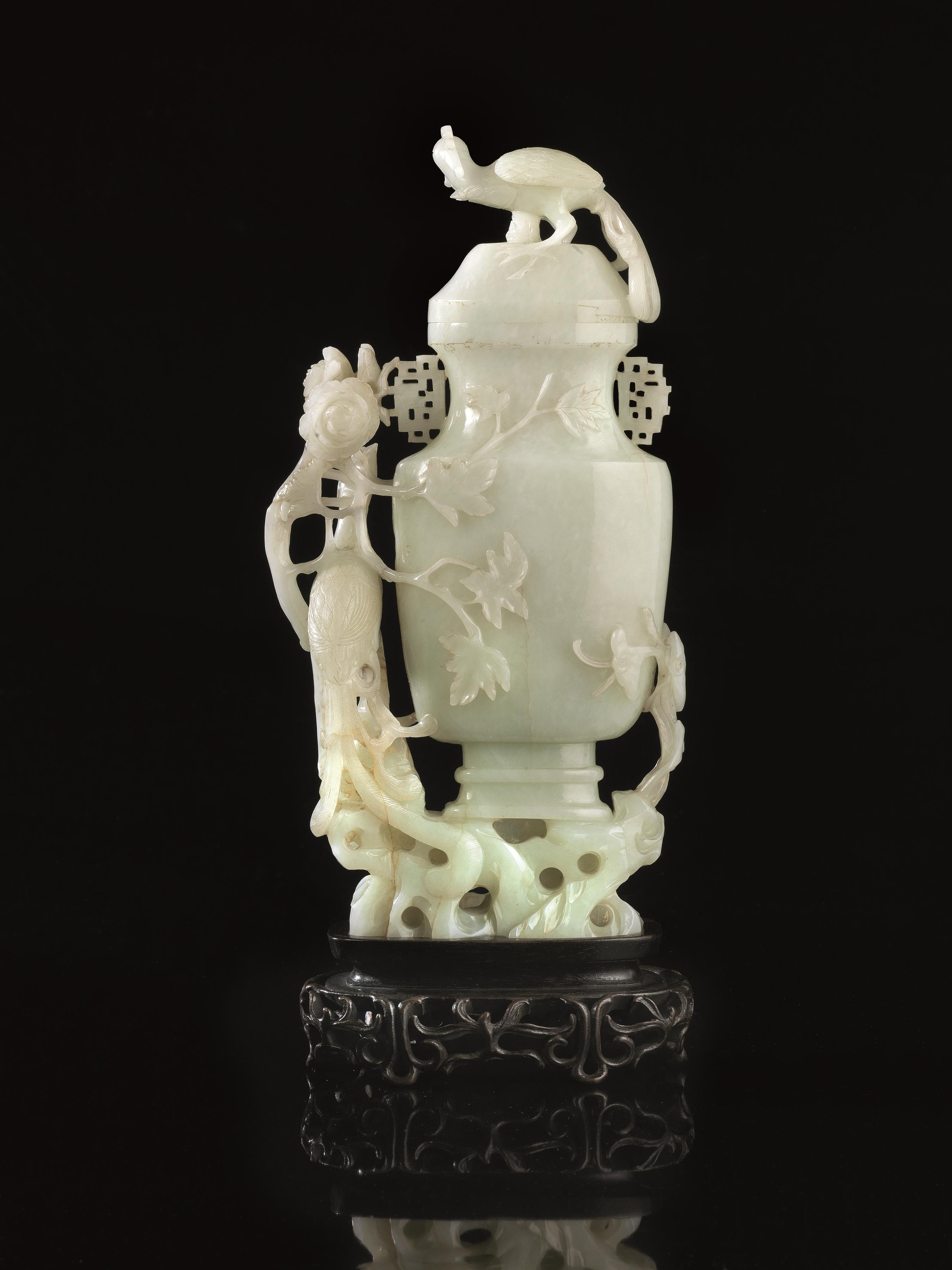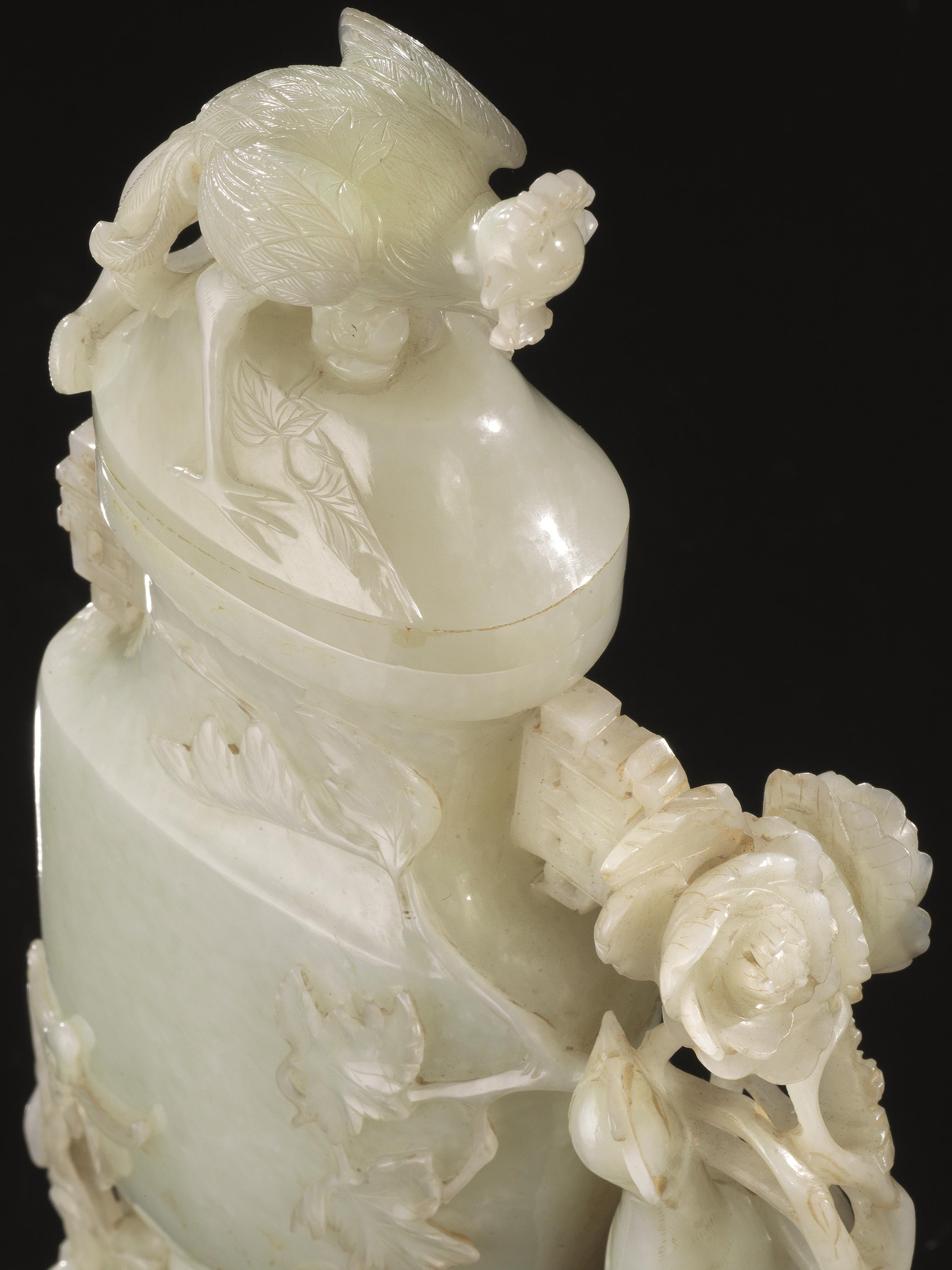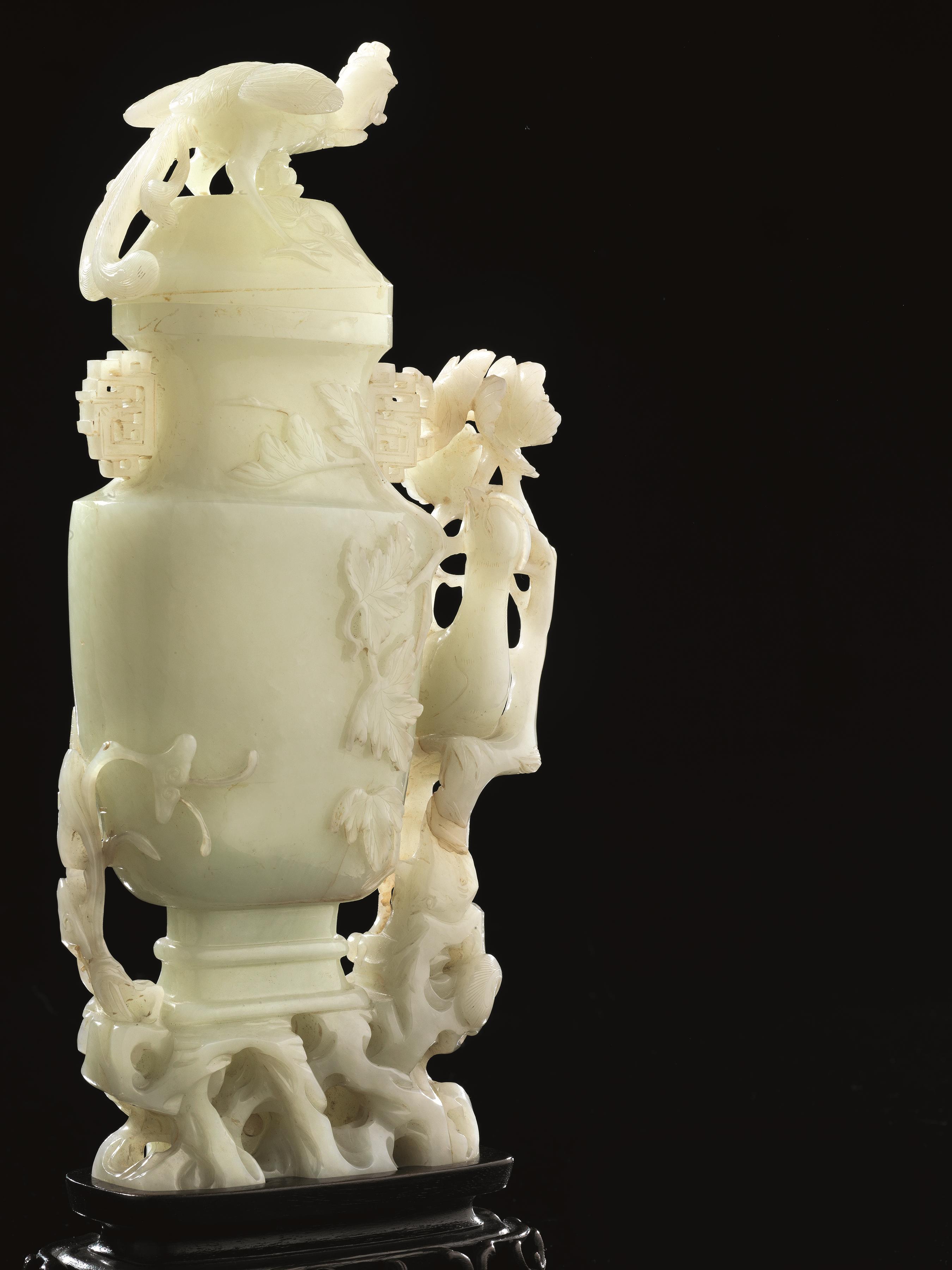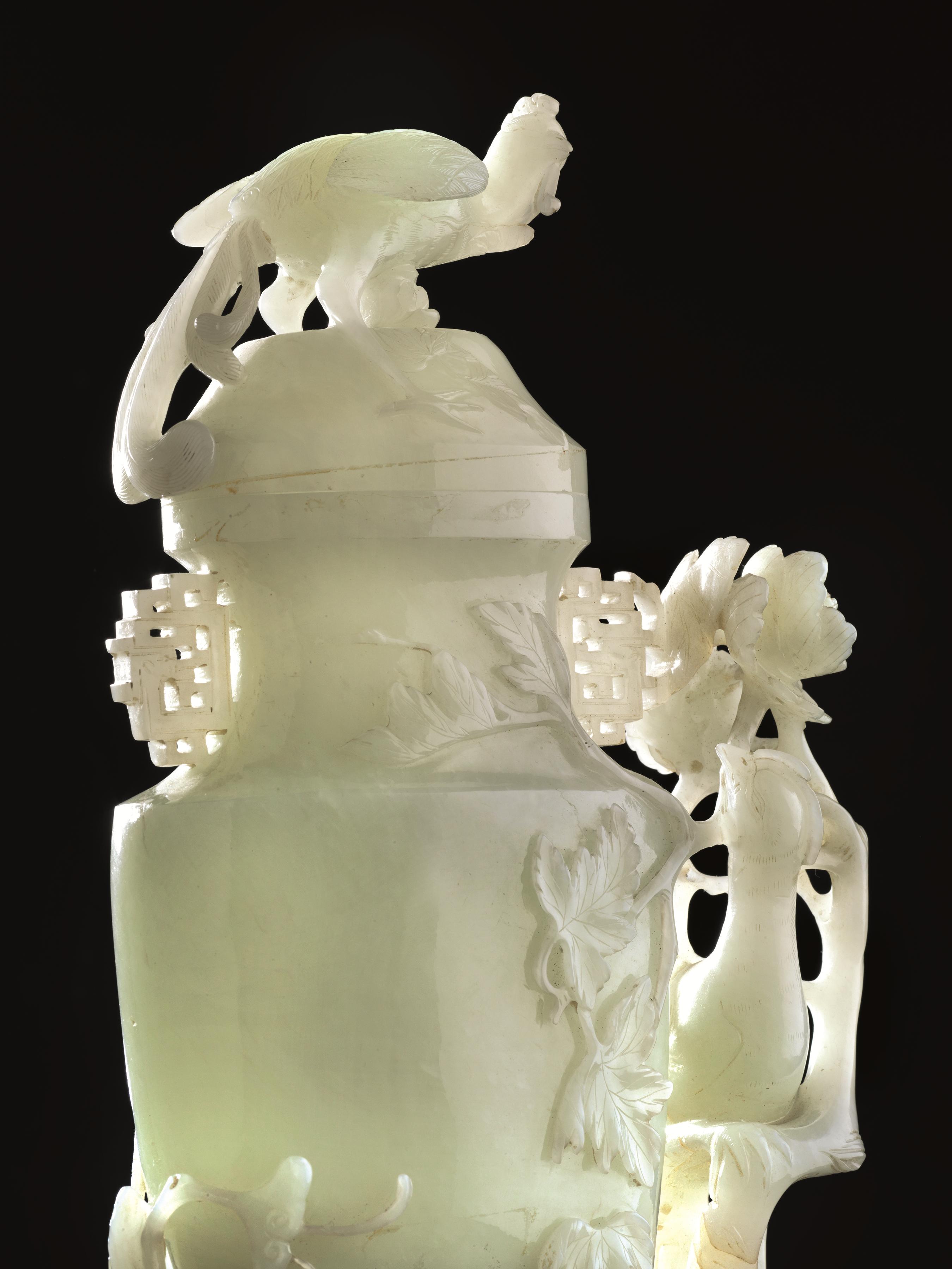 A translucent white jade carving of a baluster vase and cover displaying phoenix under a flowering prunus of a peony China Qing Dynasty, H. 32,7 cm, W. 16 cm