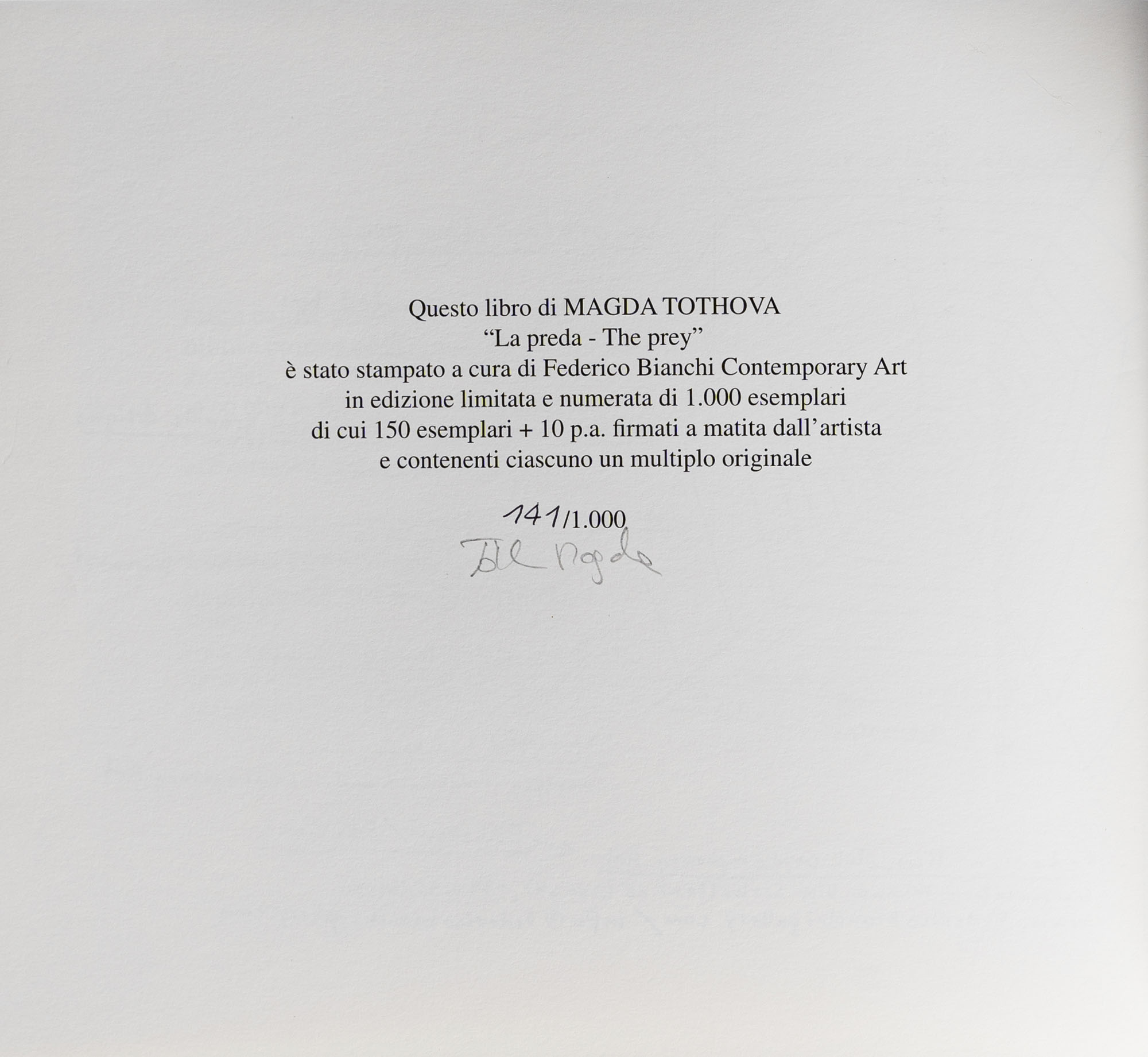 MAGDA TOTHOVA(1979)La preda / The Prey2007Serigrafia, es. 141/150 e libro d'artista, es. 141/1000, su una tiratura di 1000 esemplari numerati di cui 150 + 10 p.a. firmati a matita dall'artista e contenenti ciascuno un multiplo originale20 x 23 cmSerigrafia firmata a matita in basso a destra e numerata in basso a sinistraLibro firmato e numerato sull'ultima paginaPROVENIENZA:Collezione privata, Milano