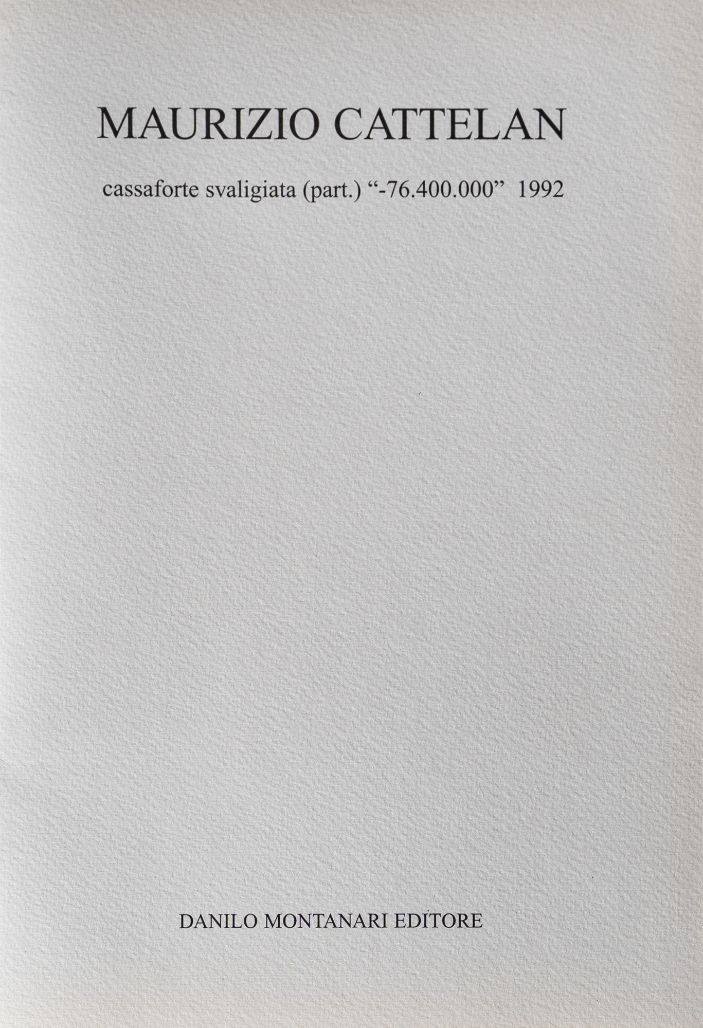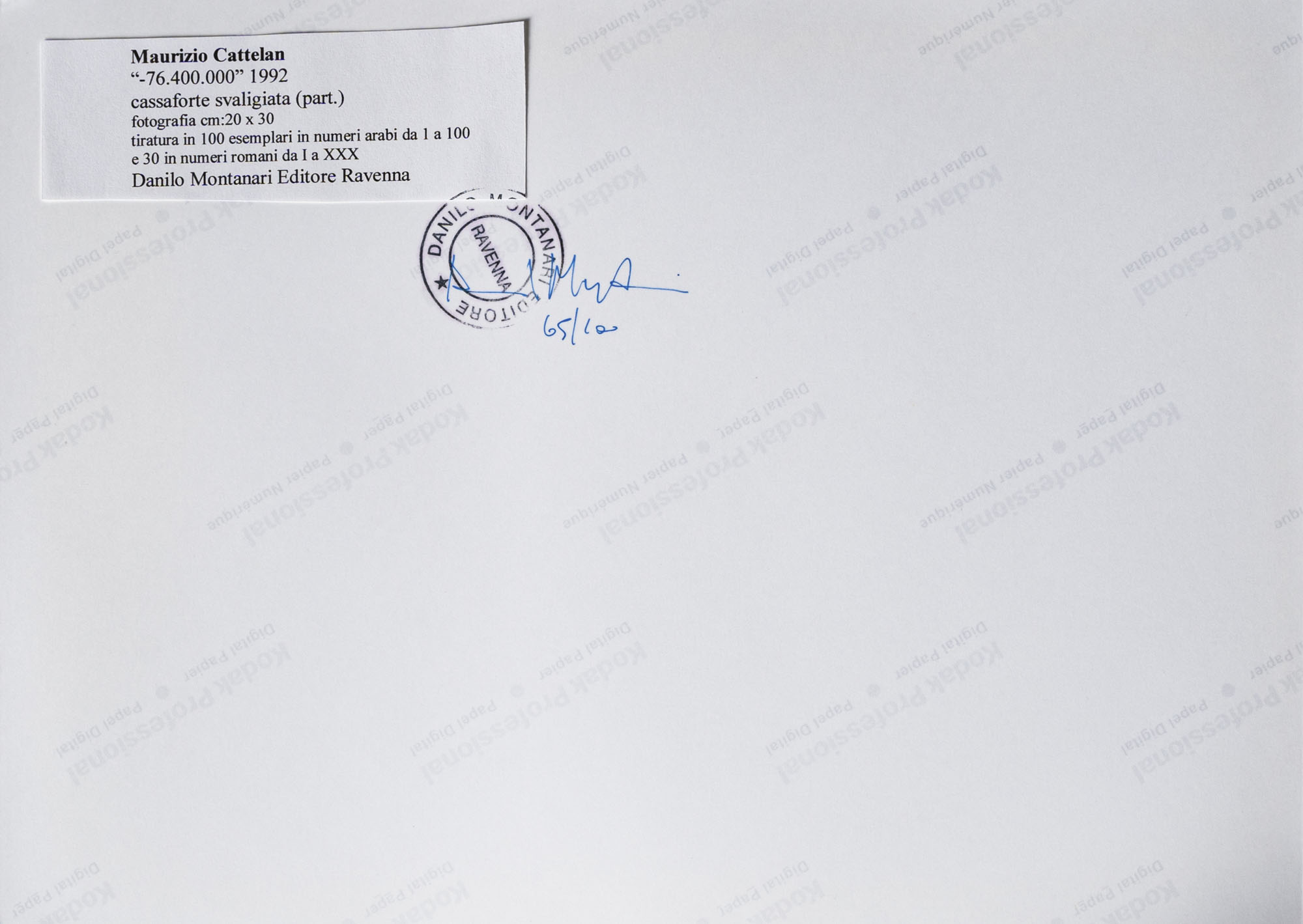 MAURIZIO CATTELAN(1960)Cassaforte svaligiata (part.) - 76.400.0001992Cartella contenente una stampa cibachrome, es. 65/100 su una tiratura complessiva di 100 esemplari in numeri arabi e 30 in numeri romani, Danilo Montanari Editore, RavennaDimensioni della cartella: 32 x 22 cmDimensioni della stampa cibachrome: 20 x 27,8 cmTimbro e firma Danilo Montanari Editore e numerazione al retro della stampa cibachromePROVENIENZA:Collezione privata, Milano