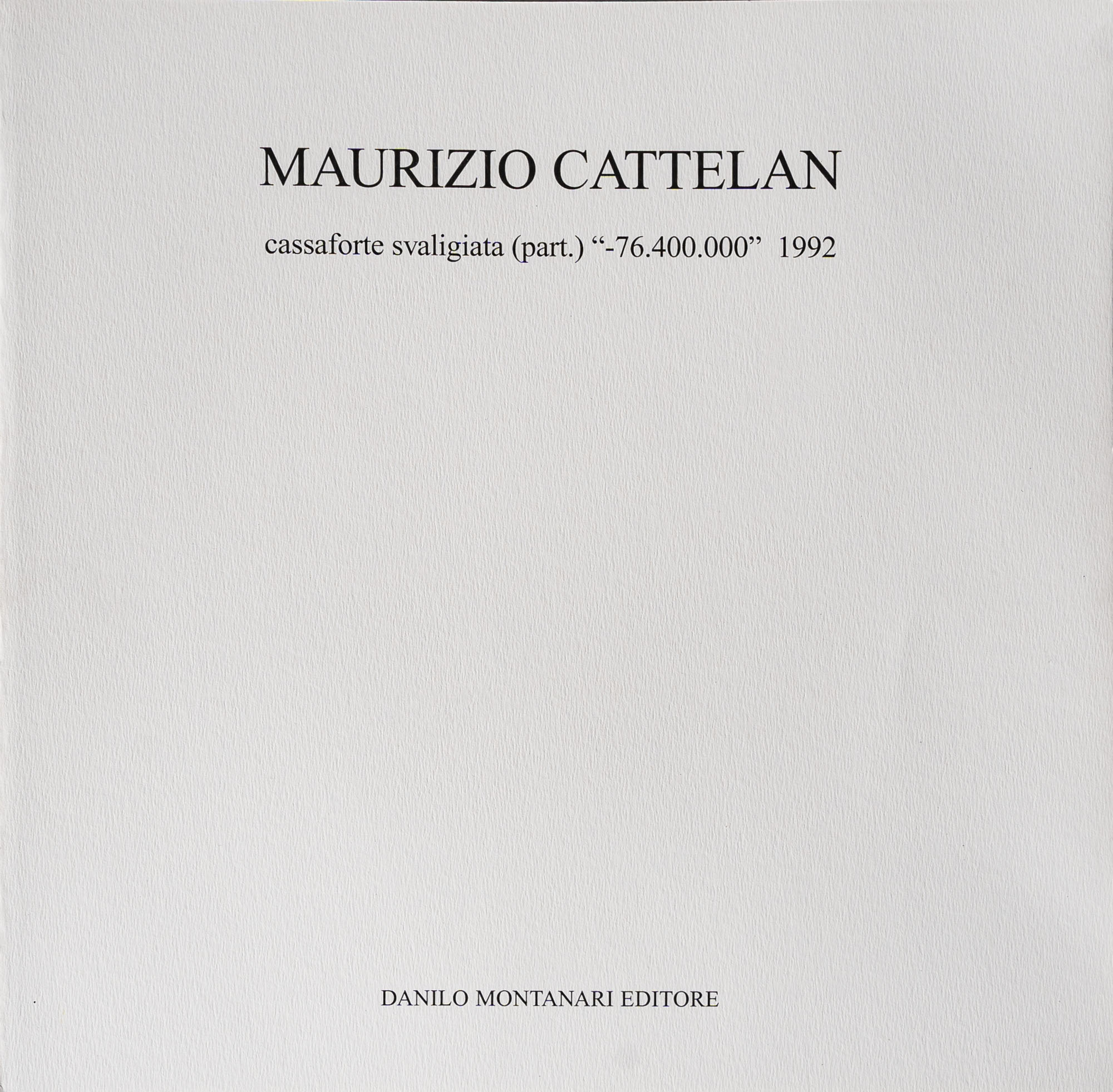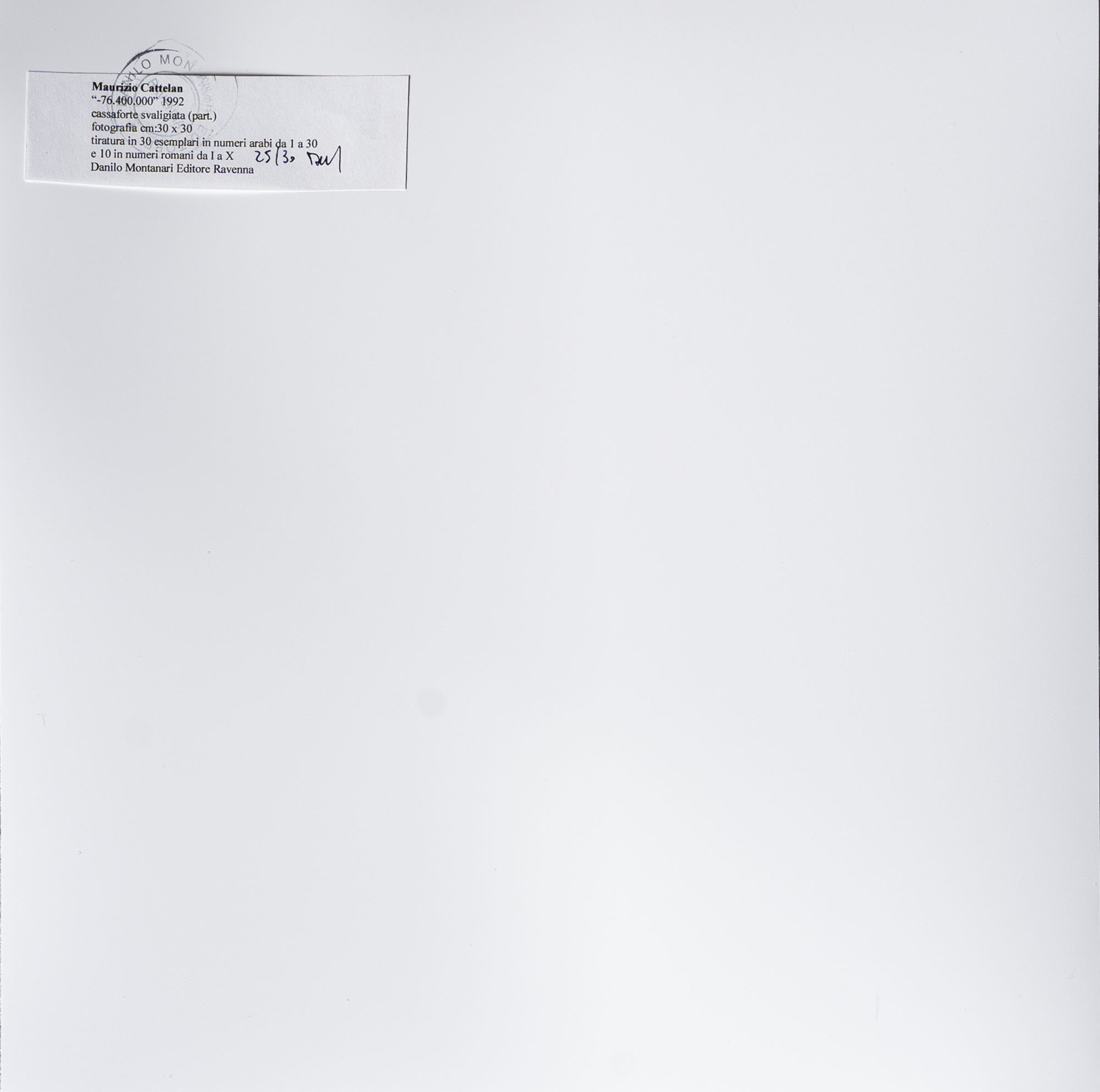 MAURIZIO CATTELAN(1960)Cassaforte svaligiata (part.) - 76.400.0001992Cartella contenente una stampa cibachrome, es. 25/30 su una tiratura complessiva di 30 esemplari in numeri arabi e 10 in numeri romani, Danilo Montanari Editore, RavennaDimensioni della cartella: 31 x 31 cmDimensioni della stampa cibachrome: 30 x 30 cmTimbro e firma Danilo Montanari Editore e numerazione al retro della stampa cibachromePROVENIENZA:Collezione privata, Milano