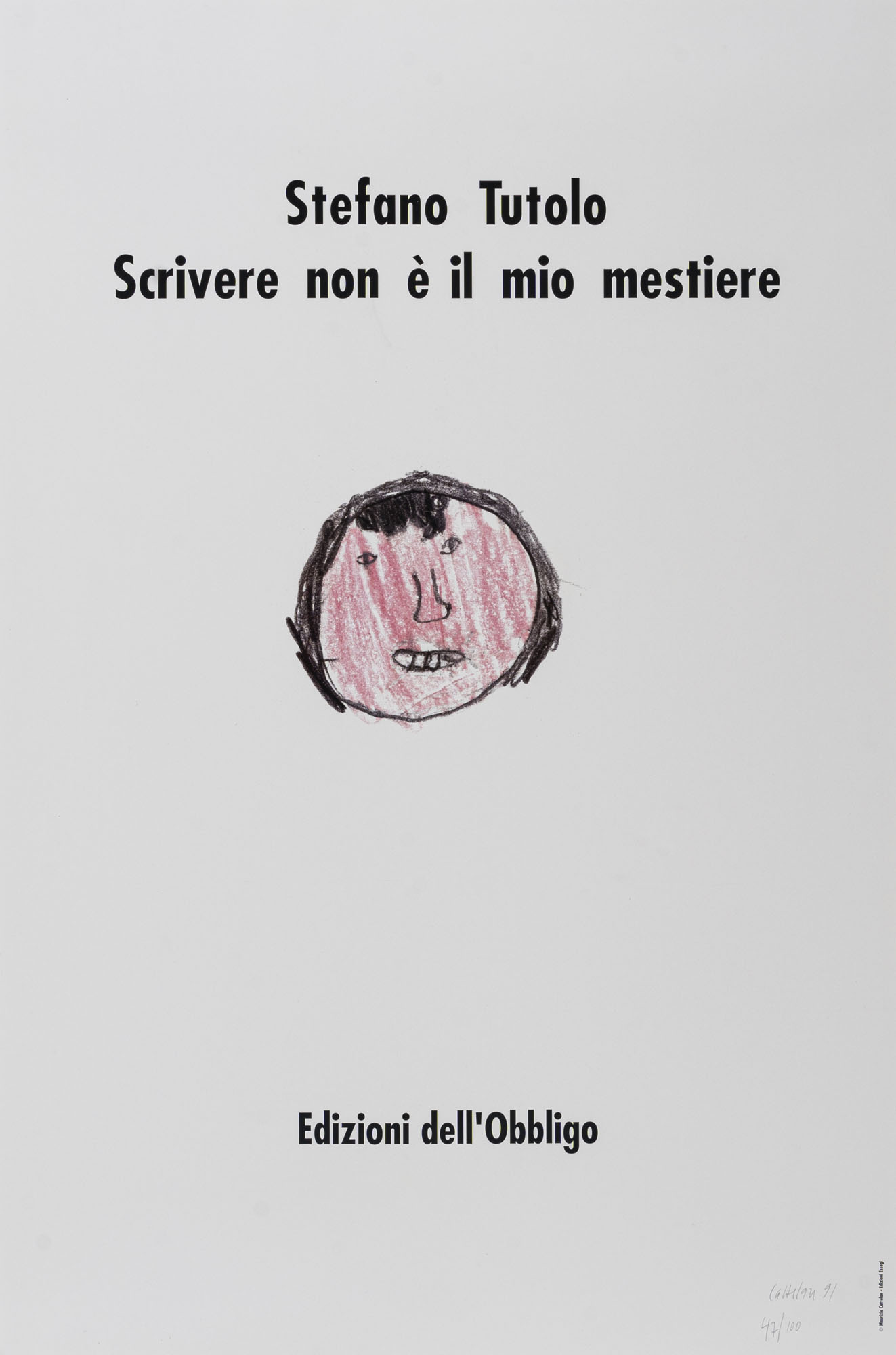 MAURIZIO CATTELAN(1960)Edizioni dell'obbligo1991Litografia, es. 47/100 su una tiratura complessiva di 100 esemplari firmati, datati e numerati, Edizioni Essegi, Ravenna83 x 55 cmFirmata, datata e numerata in basso a destraPROVENIENZA:Collezione privata, MilanoBIBLIOGRAFIA:Cfr. N. Spector, Maurizio Cattelan. All, catalogo della mostra tenutasi presso il Solomon R. Guggenheim Museum, 4 novembre 2011 - 22 gennaio 2012, New York, Edizioni The Solomon R. Guggenheim Foundation, New York, pag. 188 (ill.)Cfr. V.Peruzzi, MAURIZIO CATTELAN GRAFICHE E MULTIPLI - graphics and multiples, 2012, pag. 57 (ill.)