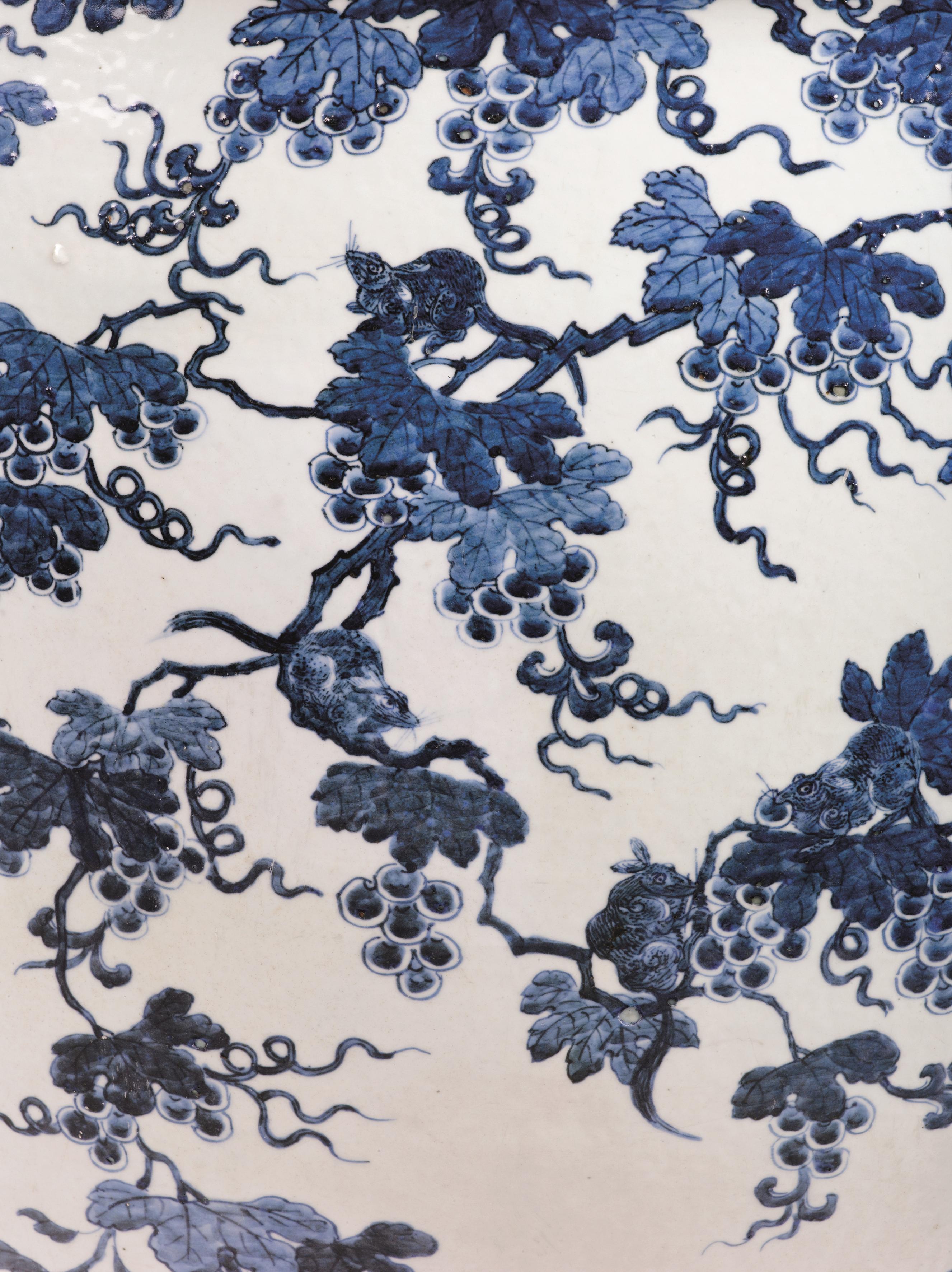 Il vaso di eccezionale dimensione è decorato con il caratteristico motivo dei tralci di vite con grandi grappoli d’uva sui quali sono appoggiati degli scoiattoli intenti a correre tra un ramo e l’altro.