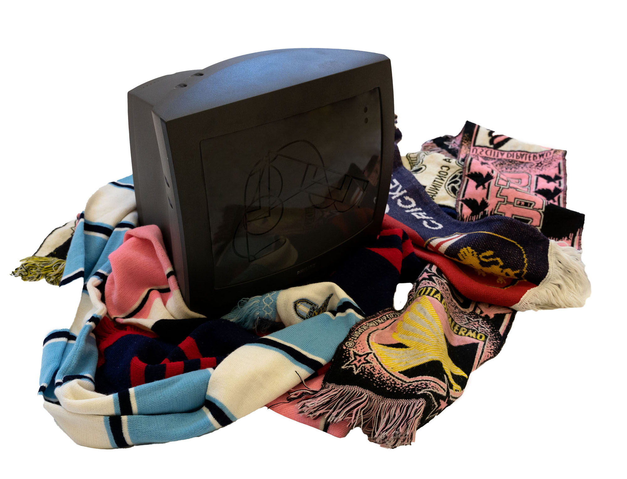 PIERRE POGGI(1954)Disegno animatoInstallazione composta da un televisore con pellicola filmica adesiva ritagliata e sciarpe, esemplare unicoDimensioni variabiliOpera accompagnata da certificato di autenticità a cura della Galleria Federico Bianchi Contemporary Art, Milano e firmato dall'artistaPROVENIENZA:Galleria Federico Bianchi Contemporary Art, MilanoCollezione privata, LeccoESPOSIZIONI:18 maggio - 5 luglio 2006, You'll never walk alone, Galleria Federico Bianchi Contemporary Art, Milano