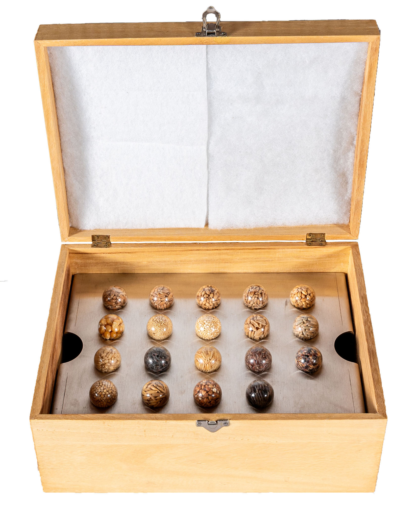 ANDREA CARETTO, RAFFAELLA SPAGNAPlanisfero_Luoghi di domesticazione2006Installazione composta da 19 sfere di vetro contenenti 19 specie di cereali diversiDimensioni variabiliDiametro di ciascuna sfera: 2,5 cmPROVENIENZA:Collezione privata, Torino
