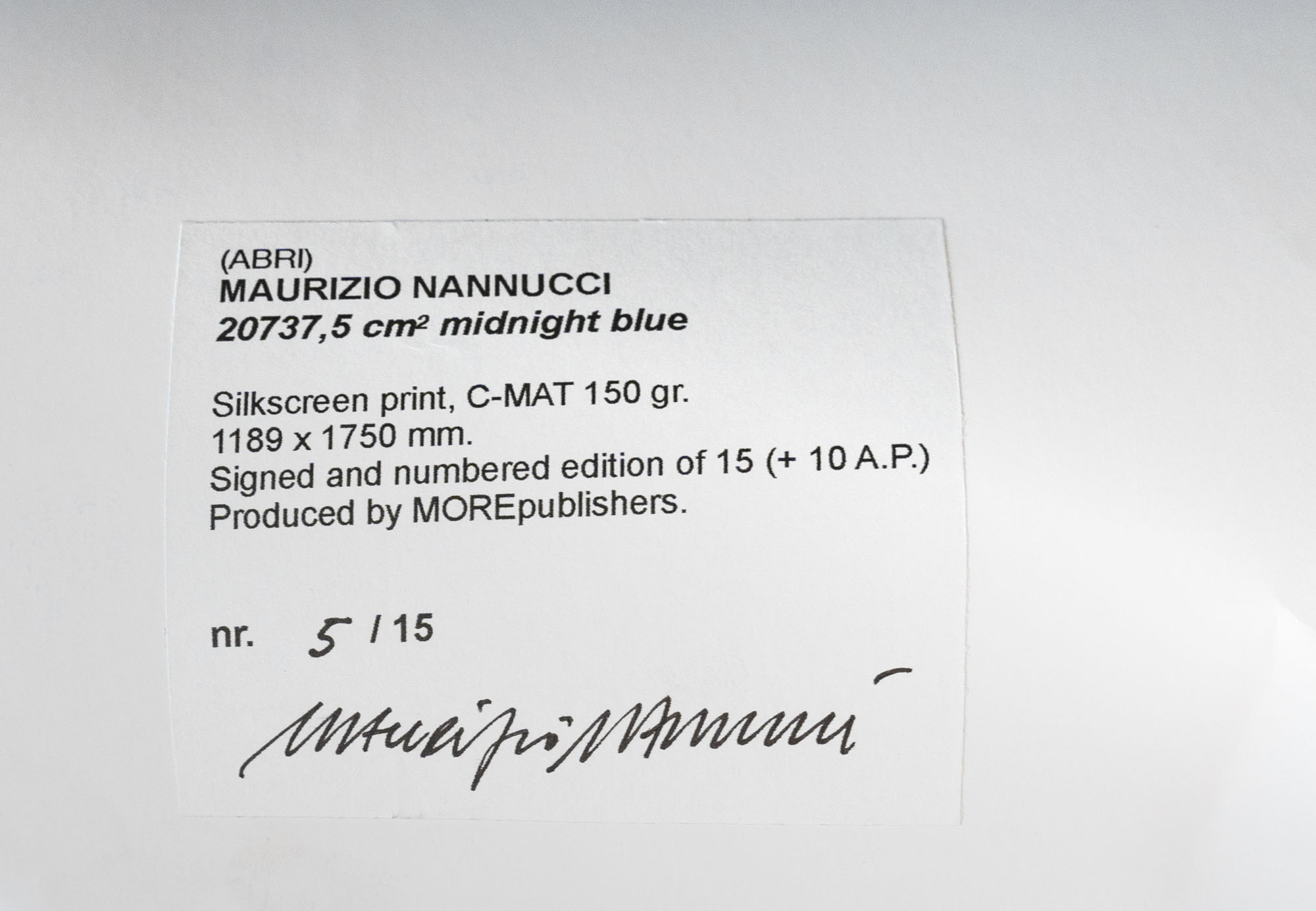 MAURIZIO NANNUCCI(1939)20737,5 cm2 midnight blueSerigrafia, es. 5/15 su una tiratura complessiva di 15 esemplari in numeri arabi e 10 prove d'artista, MOREpublishers175 x 119 cmFirma, titolo e numerazione su etichetta al retroPROVENIENZA:Collezione privata, Trapani