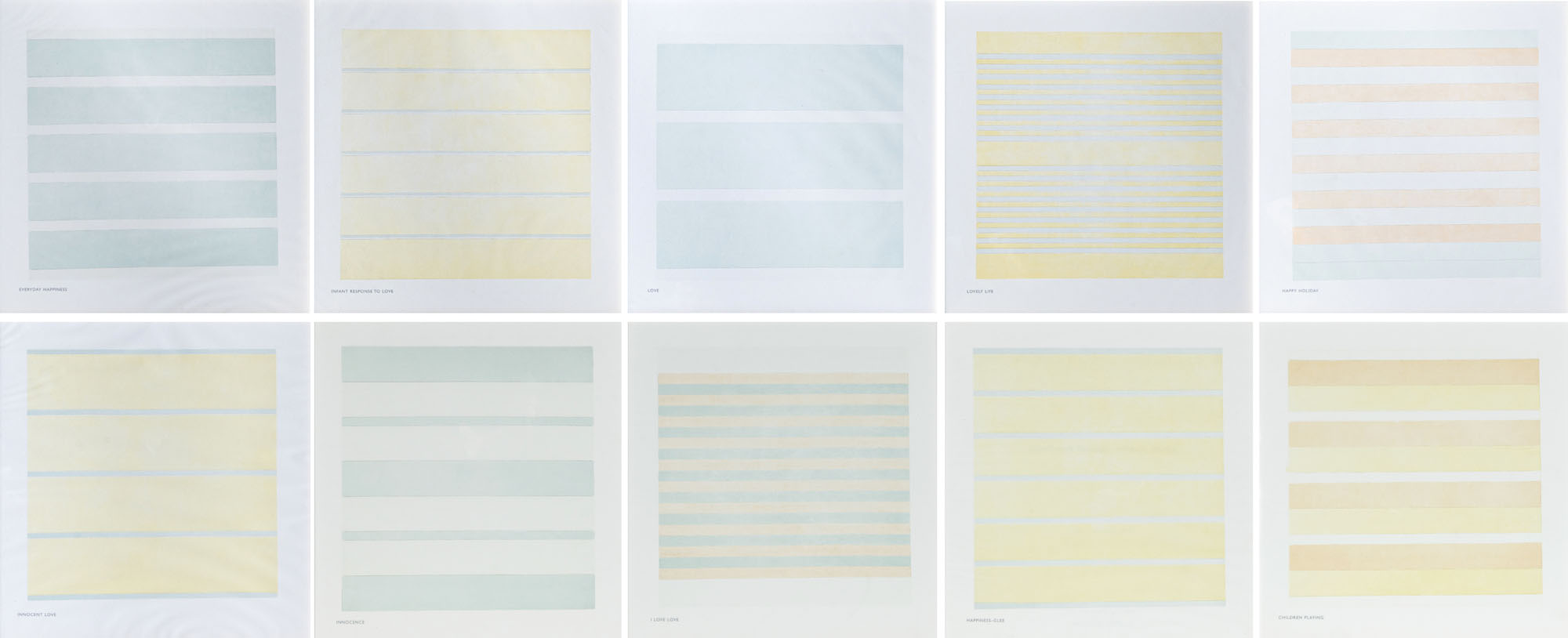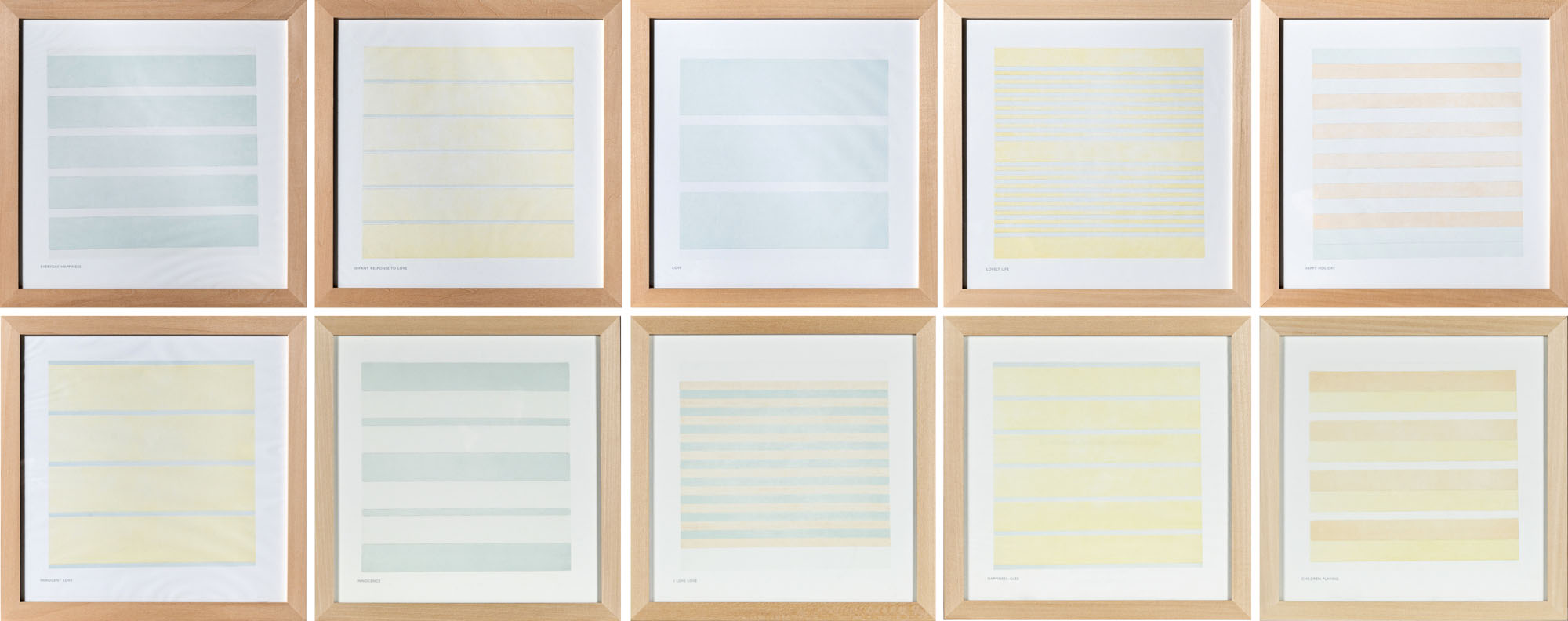 AGNES MARTIN(1912 - 2004)Senza titolo (Recent Paintings)2000Portfolio di 10 litografie su carta traslucida realizzato in occasione della mostra Recent Paintings presso la Pace Wildenstein, New York (27 aprile - 10 giugno 2000)Dimensioni di ciascuna litografia: 27 x 27 cmPROVENIENZA:Collezione privata, Milano