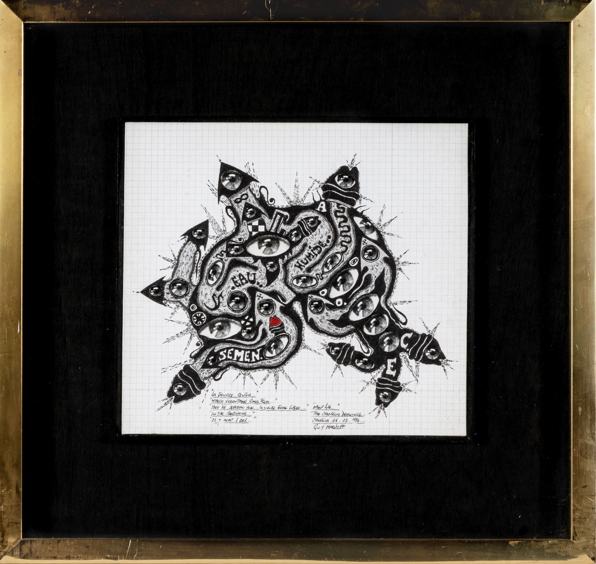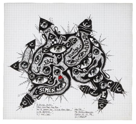 GUY HARLOFF(1933 - 1991)About life...1974Collage e inchiostri su carta quadrettata25,8 x 28,5 cmFirmato, datato e titolato in basso a destraOpera inserita nell'Archivio Guy Harloff e accompagnata da certificato di autenticità a cura dello Studio d'Arte Nicoletta Colombo, MilanoPROVENIENZA:Galleria Omar Aprile Ronda, Biella (timbro al retro)Collezione privata, Biella