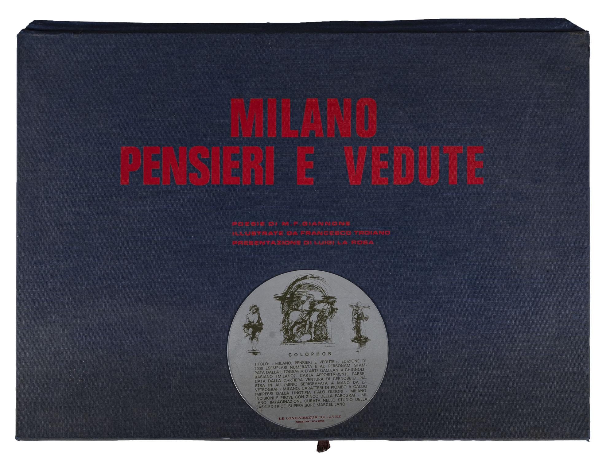 AUTORI VARIMilano. Pensieri e veduteCartella contenente poesie di M. F. Giannone illustrate da Francesco Troiano, in 2000 esemplari non numerati, Le connaisseur du Livre Edizioni d'ArteDimensioni della cartella: 43 x 60 cmPROVENIENZA:Collezione privata, Milano