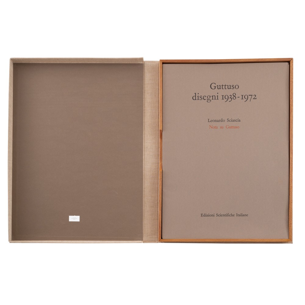 Cartella contenente trentatré riproduzioni in stampa di disegni "Guttuso disegni 1938 - 1972" edizioni scientifiche Italiane, es. C/CXIX (cartella incompleta).