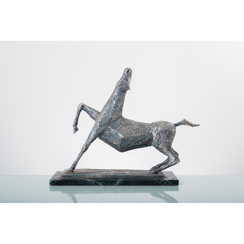 Scultura rivestita in lamina d'argento raffigurante "Cavallo" con base in marmo verde.