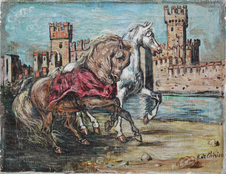 Giorgio DE CHIRICO Volos 1888 - Roma 1978 Cavalli presso un castello, 1958/1959 olio su tela oil on canvas cm. 30x40 Autentica a cura di Claudio Bruni Sakraischik, in data Roma, 13/05/1982 Certificate by Claudio Bruni Sakraischik, dated Rome, 05/13/1982 Bibliografia | Bibliography C. Bruni, ‘Catalogo Generale Giorgio De Chirico - opere dal 1951 al 1974’, Electa Editrice, 1983, Vol. VII, rif. 1094 Firma ‘G. De Chirico’ (in basso a destra) Firma ‘Giorgio De Chirico’; dichiarazione notarile di autenticità (al retro) Signed ‘G. De Chirico’ (lower right) Signed ‘Giorgio De Chirico’; notarial declaration of authenticity (on the reverse)