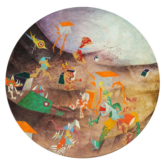 Emilio TADINI Milano 1927-2002 Viene l’uomo del ghiaccio, 1964/1965 olio su tela applicata su tavola oil on canvas laid dawn on board cm. 55 Ø Provenienza | Provenance Galleria Marconi, Milano Collezione privata, Lecco Titolo, data, firma ‘Viene l’uomo del ghiaccio, 1964-65, Emilio Tadini’ (al retro) Titled, dated, signed ‘Viene l’uomo del ghiaccio, 1964-65, Emilio Tadini’ (on the reverse)