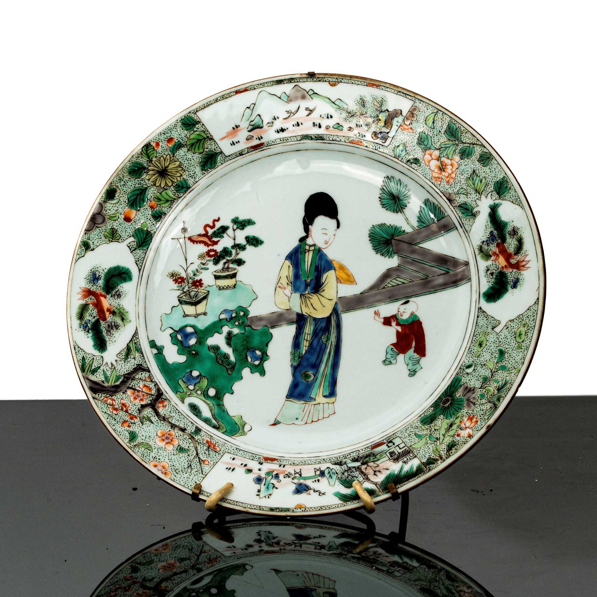 Piatto famille verte con scene di vita di una madre con suo figlio, Qing , dinastia, Kangxi-wucai , periodo