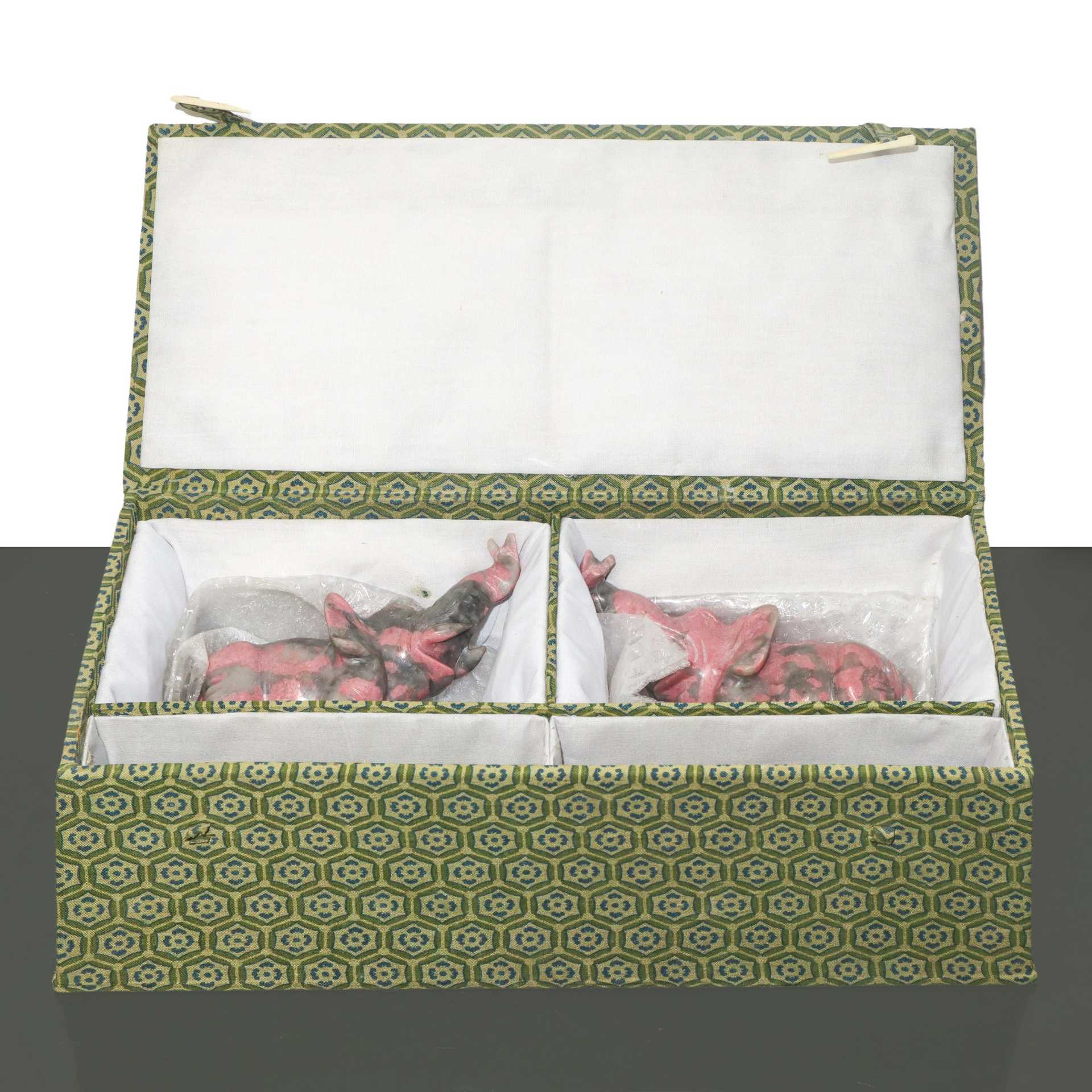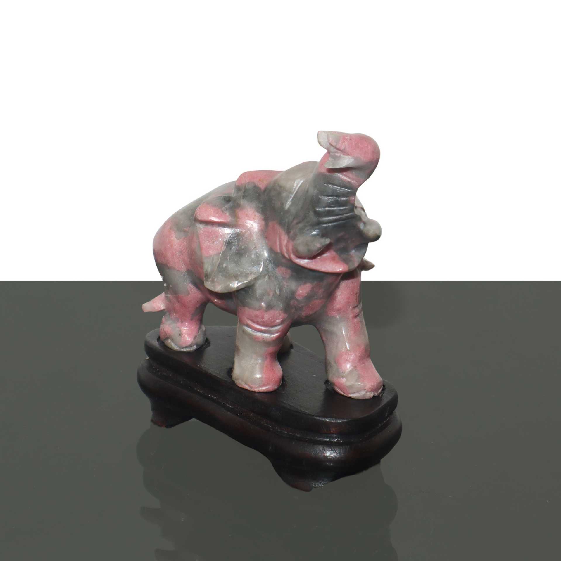 Coppia di elefanti in rodonite grigio/rosa, 20° secolo cm 10X12 com base 13X12,5 scatola cm10X32 Con scatola in stoffa. Dotati di base in legno.Con scatola in stoffa. Dotati di base in legno.