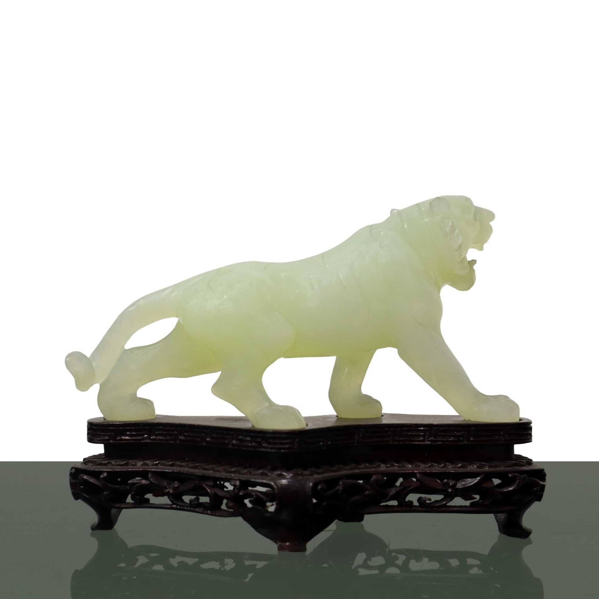 Tigre in giada verde chiaro. H cm 6,8x13 - con base H cm 10,2x14 Orecchio scalfito.Orecchio scalfito.