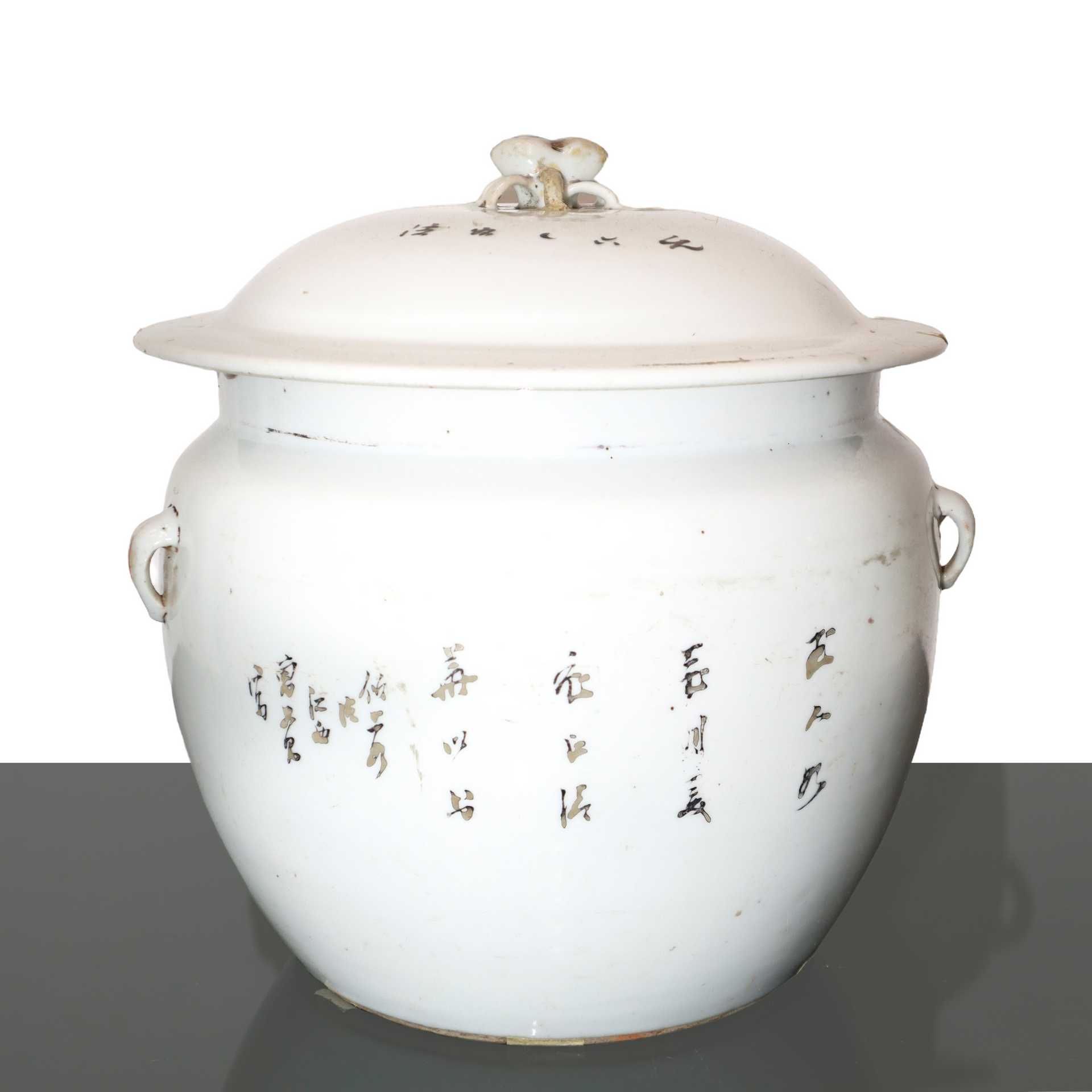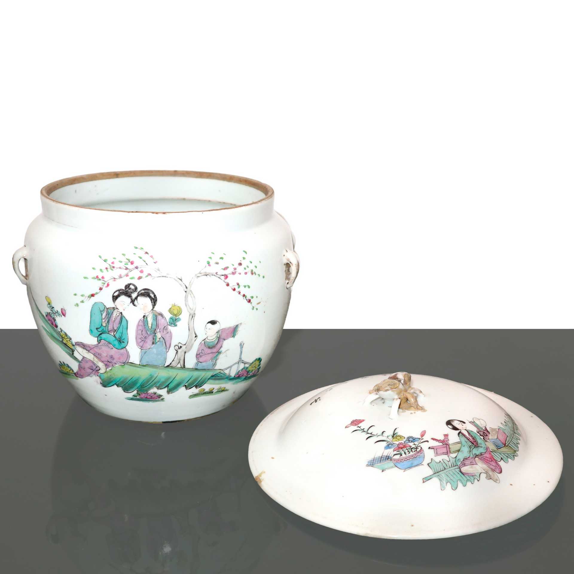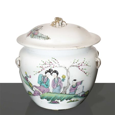 Zuppiera in porcellana bianca cinese dipinta a mano con decorazione di donne e bambini in giardino fiorito scritte in caratteri cinesi. H cm 18.5x18.8 Quattro piccoli manici. Coperchio decorato e con pomello. Timbro con caratteri cinesi e timbro in cera lacca sul fondo.Quattro piccoli manici. Coperchio decorato e con pomello. Timbro con caratteri cinesi e timbro in cera lacca sul fondo.