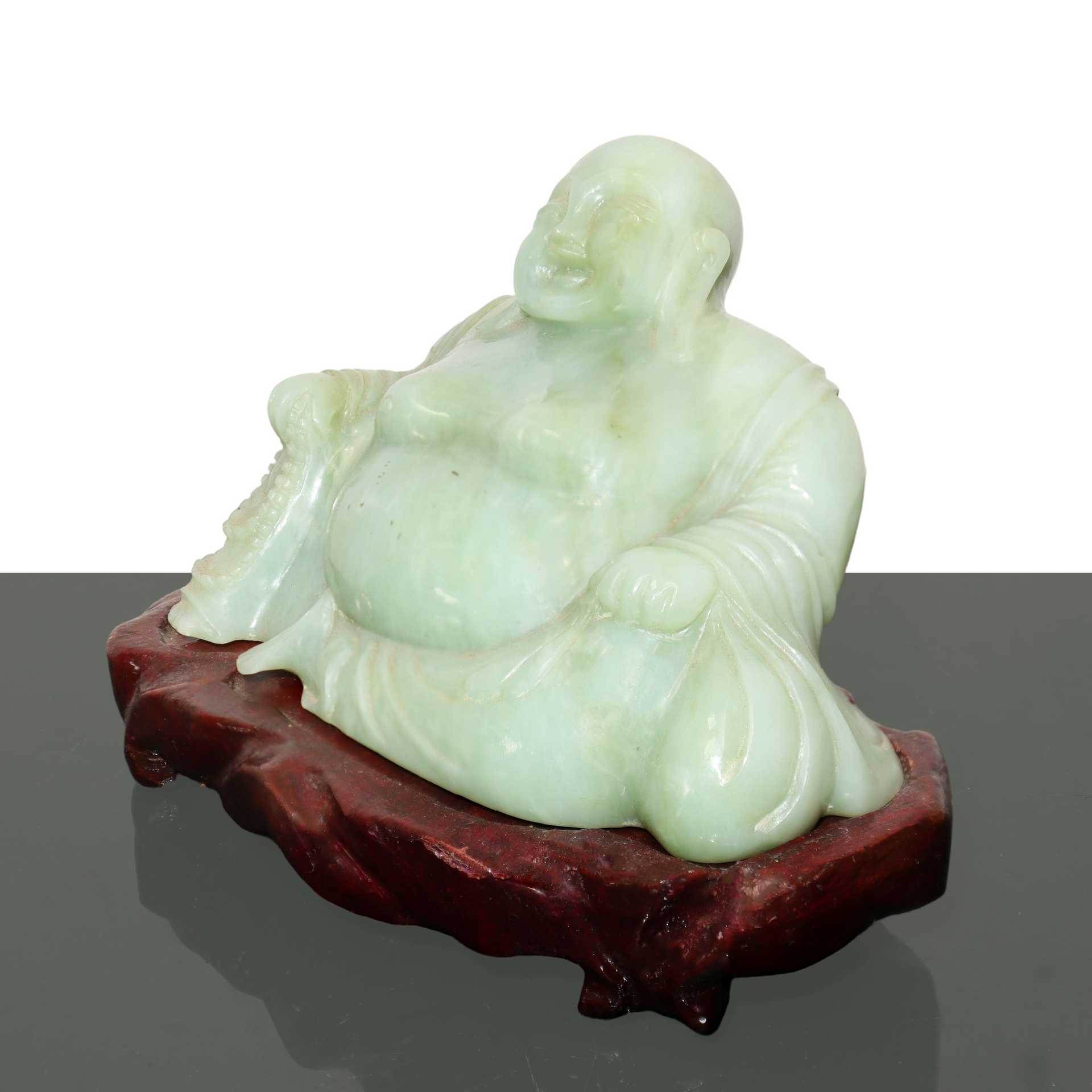 Buddha che ride in giada verde H cm 9x15 - con base H cm 11.5x17 Statua di Buddha ridente in giada verde. Base in legno. Adesivo sulla base"ASIA IMPORT, Siracusa".Statua di Buddha ridente in giada verde. Base in legno. Adesivo sulla base"ASIA IMPORT, Siracusa".