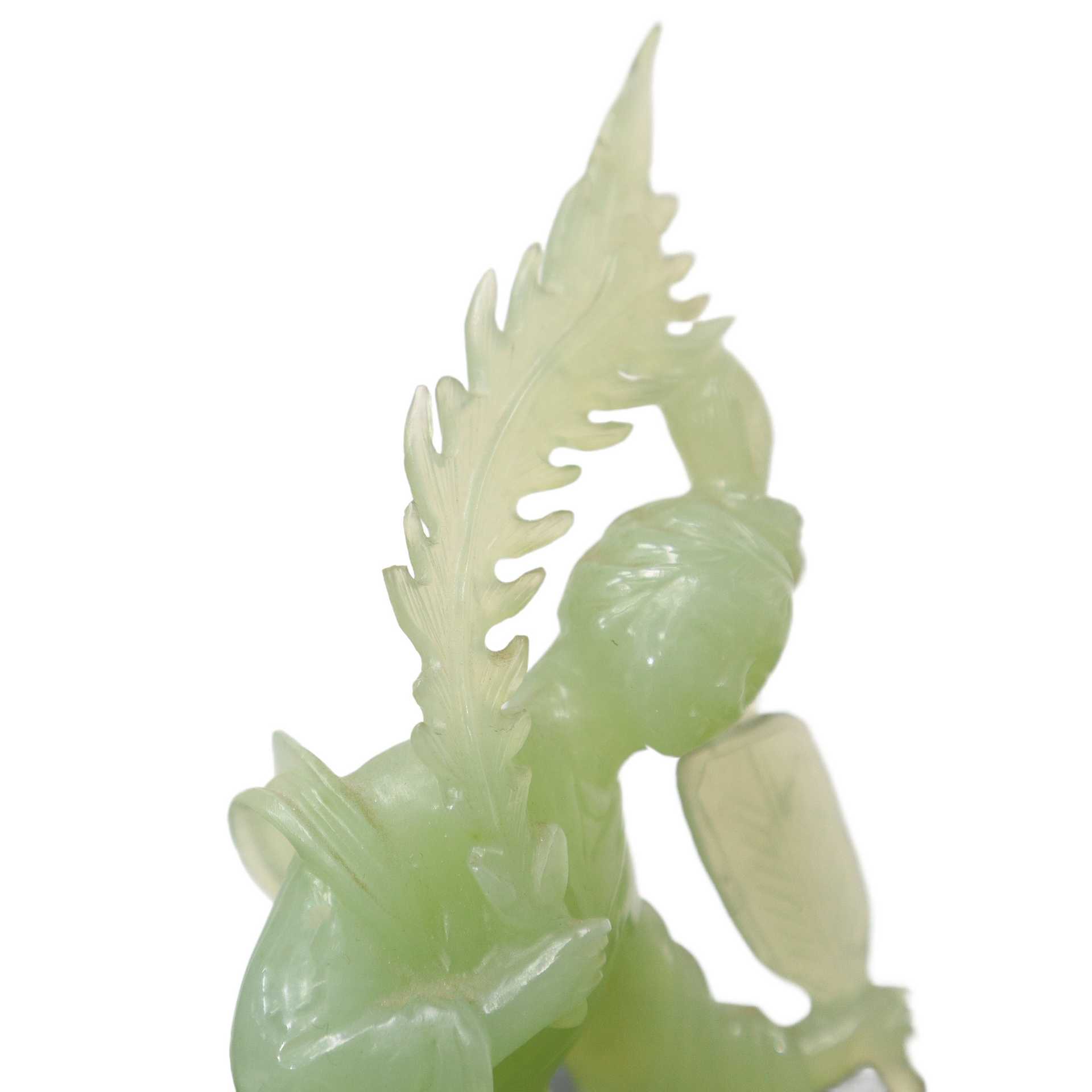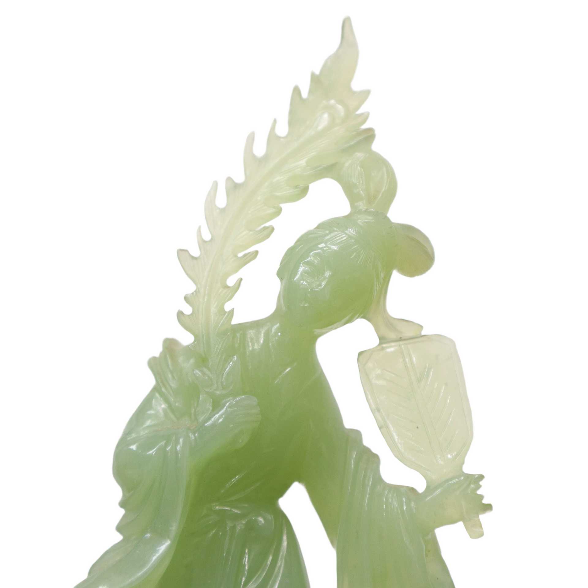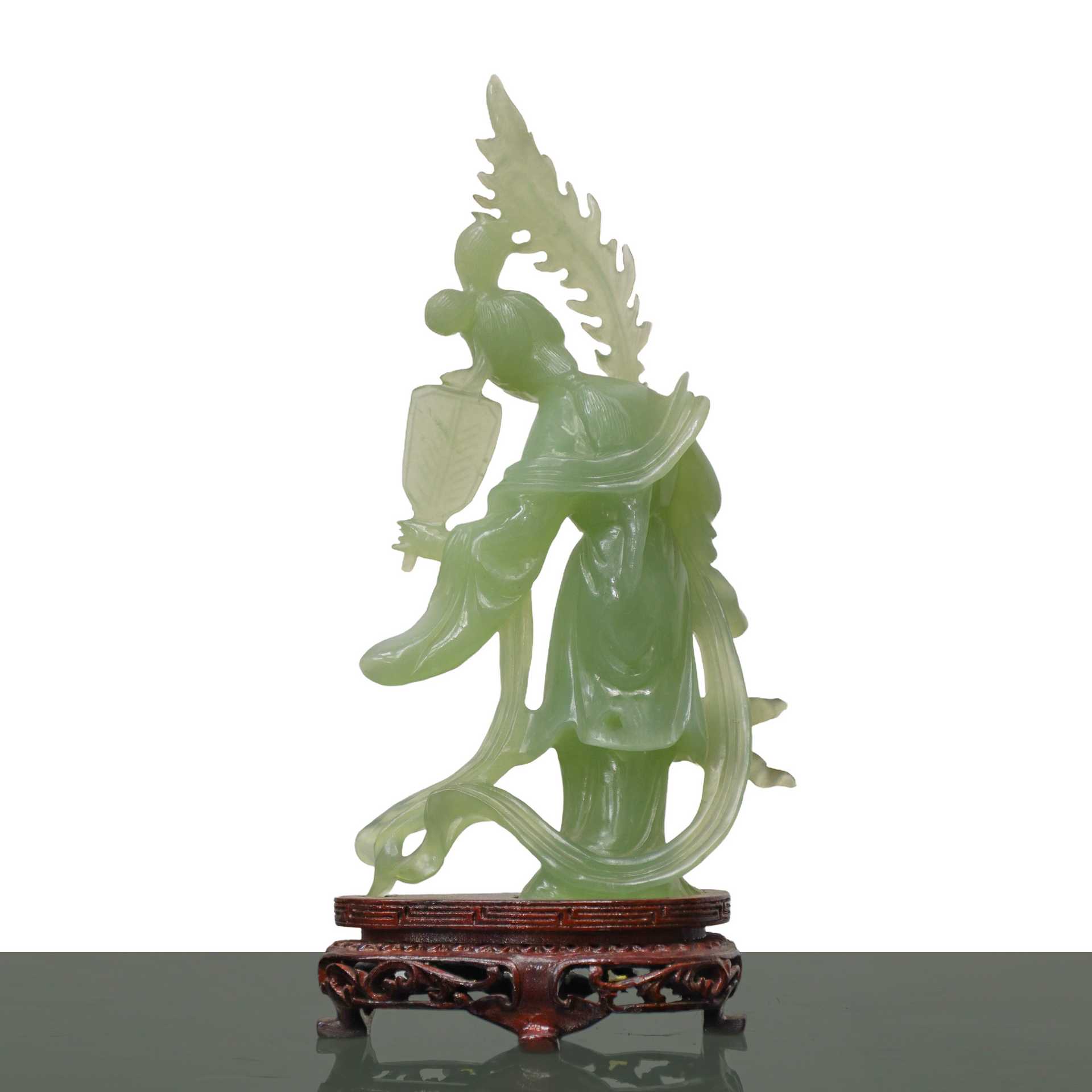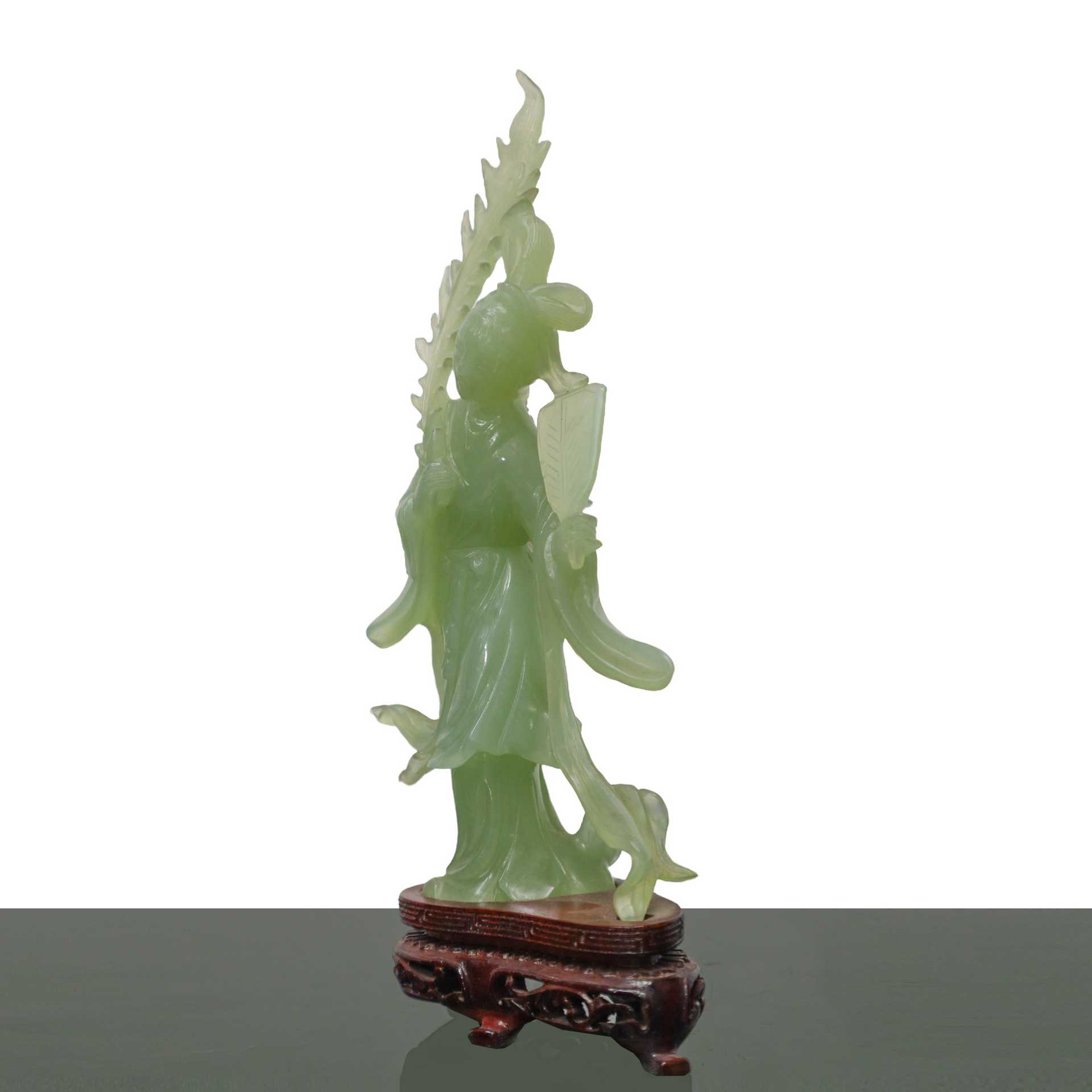 Guanin con ventaglio in giada verde chiaro H cm 19x11 - con base H cm 22 Con base in legno.Con base in legno.