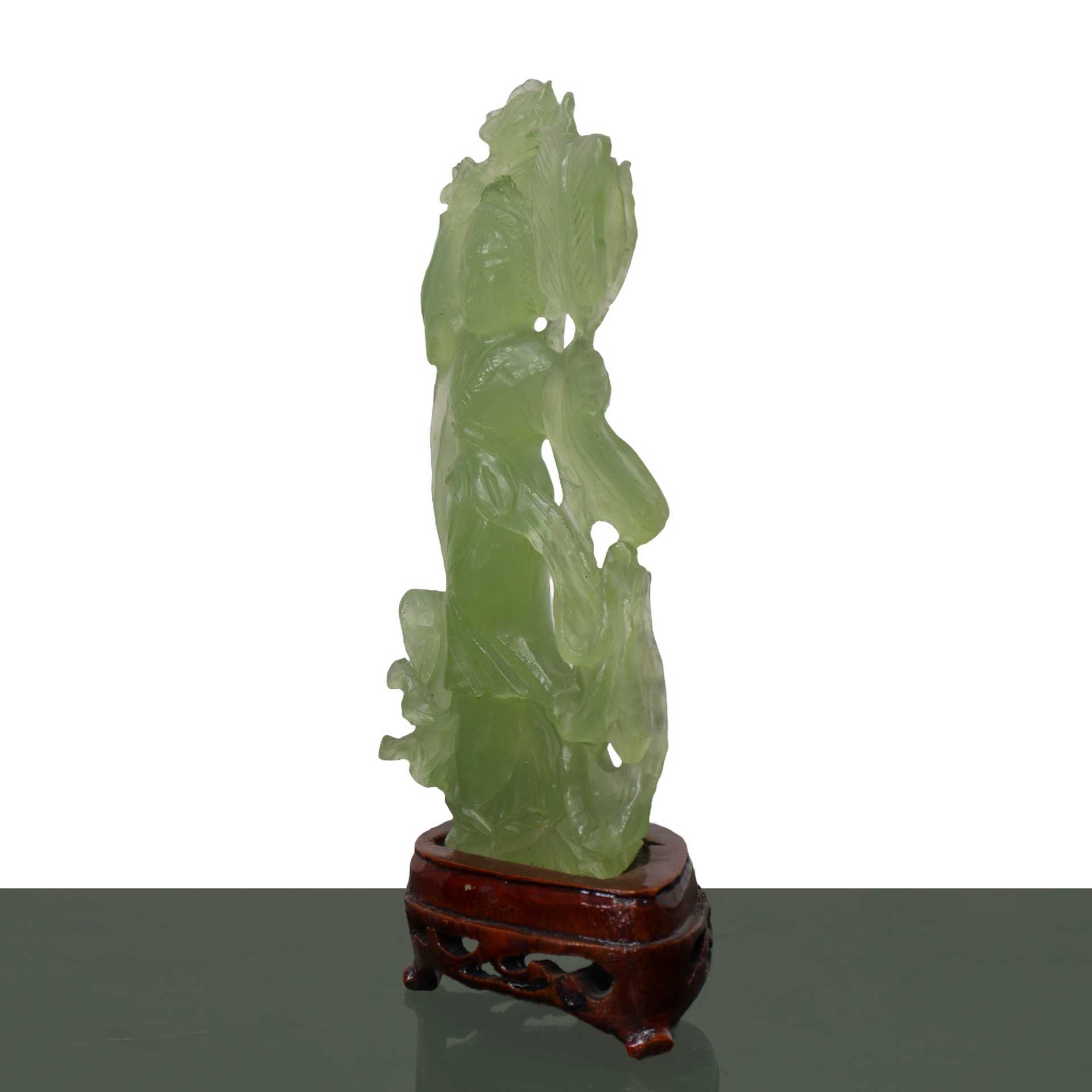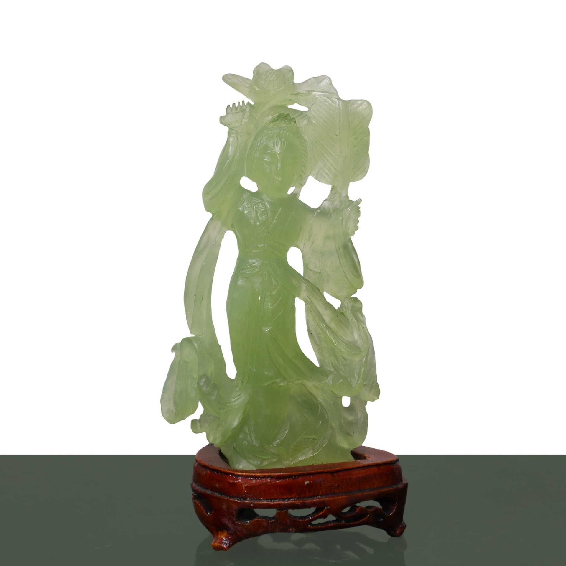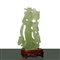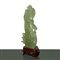 Guanin in giada verde chiaro con fiore e ventaglio H cm 16,5x10 - con base H cm 20 Piccole scalfiture sulla superficie.Piccole scalfiture sulla superficie.