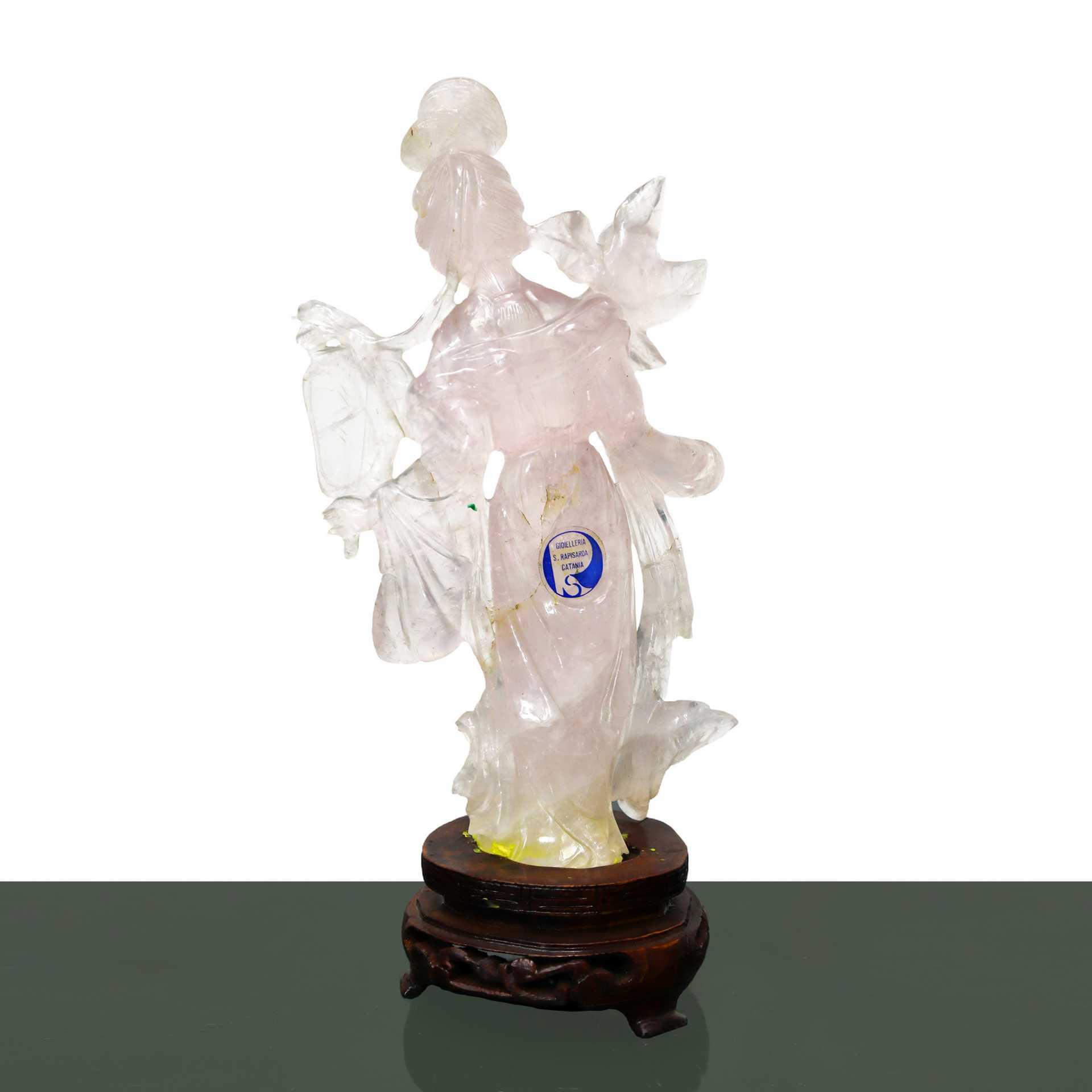Guanin con fiore e ventaglio in quarzo rosa chiaro H cm 18,5x10 - con base H cm22 Superficie frontale scalfita, frattura al retroSuperficie frontale scalfita, frattura al retro