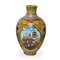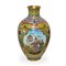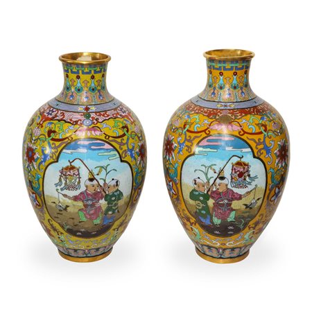 Coppia di grandi vasi in metallo policromo dipinti con motivi floreali e sul fronte e sul retro con scene di genere
