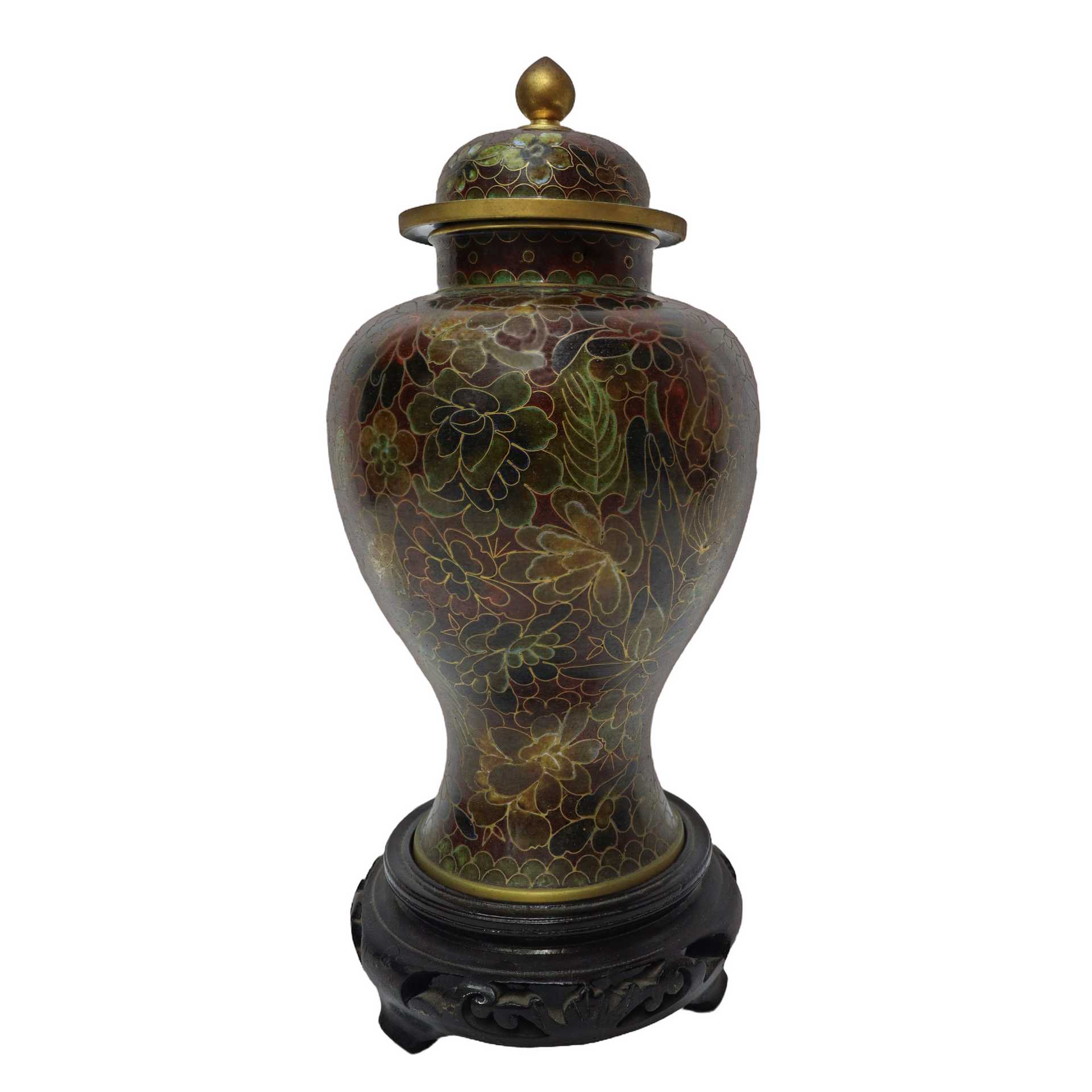 Potiche cinese cloisonne in ceramica marrone con decori dorati floreali, interno turchese H cm 20,5x10 Con base in legnoCon base in legno